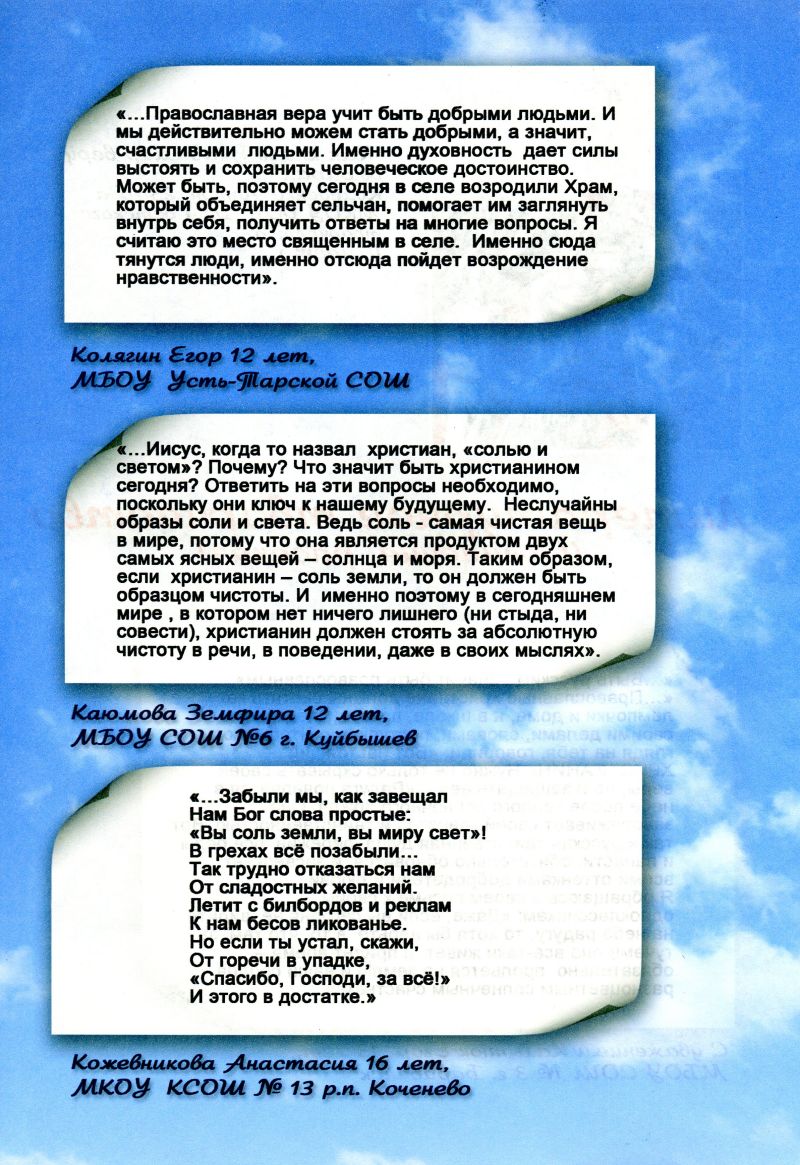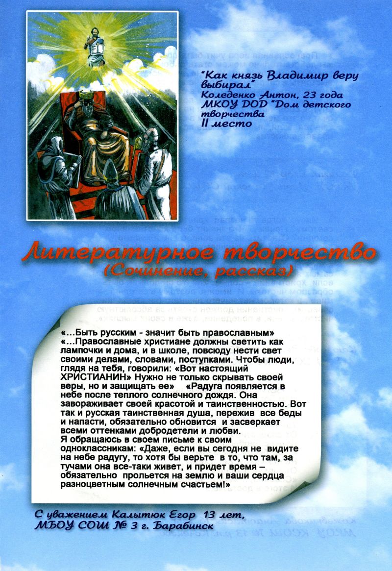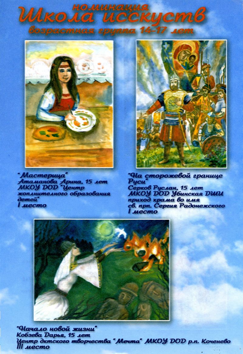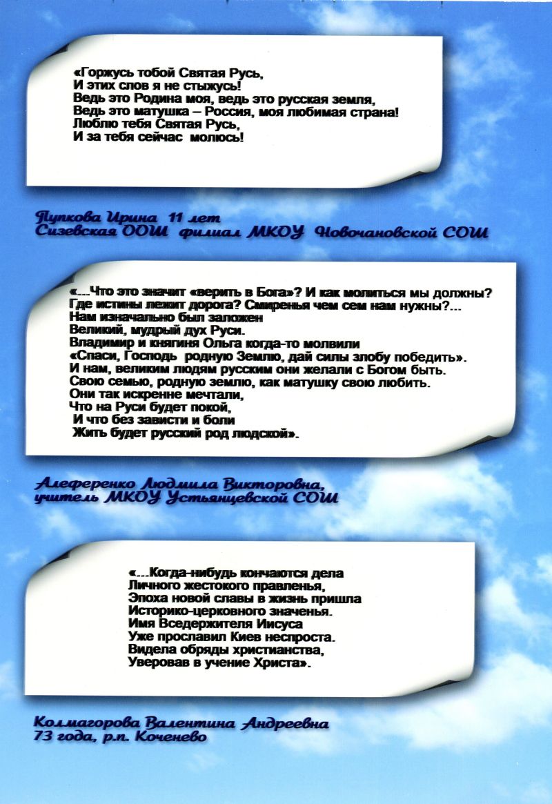Награждение победителей Епархиального областного конкурса «Русь Святая живёт…»Жизнь в православии Верность цивилизационному выбору Крещение Руси произошло в 988 году, и это событие, значение которого трудно переоценить, связано с именем князя Владимира, которого историки назвали великим, Церковь – святым равноапостольным, а народ прозвал Владимиром Красное Солнышко. 28 июля 2015 года исполняется 1000 лет со дня преставления святого равноапостольного князя Владимира, и уже десять столетий Россия верна его цивилизационному выбору. Всегда интересно с помощью специалистов, которые глубоко изучили эту тему, как бы вернуться к самому началу христианской истории Руси, а затем ознакомиться с её современными реалиями. Вот эту возможность и предоставила прошедшая в минувшую среду, 11 февраля, районная образовательная конференция «Князь Владимир. Цивилизационный выбор Руси». Подготовленная по благословению Епископа Каинского и Барабинского Феодосия приходом храма во имя Архистратига Михаила, она состоялась на площадке Центра детского творчества «Мечта», собрав представителей – школьников и преподавателей – образовательных учреждений района, библиотекарей и других культработников. Зал был заполнен до отказа. А почётными гостями конференции можно назвать не только заместителя министра образования, науки и инновационной политики Новосибирской области Д. А. Метёлкина и начальника Управления образования администрации Коченёвского района О. А. Пучкову, но и почти тридцать из 37-и приглашённых на награждение призёров областного епархиального конкурса «Русь Святая живёт…», которые смогли приехать в р.п. Коченёво издалека. Участники конкурса, ставшие его победителями, из Краснозёрского, Татарского, Барабинского, Куйбышевского, Венгеровского, Убинского, Доволенского, Усть-Таркского, Ордынского, Искитимского районов заодно заметно расширили и географию конференции. Церемония их торжественного награждения предварила пленарную часть заседания, дипломы и памятные подарки вручали руководитель отдела образования и катехизации Каинско-Барабинской Епархии, настоятель коченёвского храма во имя Архистратига Михаила протоиерей Тимофей Морев и заместитель министра образования Дмитрий Метёлкин. А перед тем в своём приветствии к собравшимся Дмитрий Александрович сказал: «Постигать прошлое можно разными путями, в том числе и через чувства. Эту возможность нам даёт творчество… Хочу пожелать дальнейших успехов по пути духовного и интеллектуального становления, ясного понимания, какие основы в истории нашего государства являются подспорьем в трудные моменты». Хочется добавить, что Коченёвский район тоже может гордиться немалым числом призёров этого конкурса. Среди них есть взрослые участники – художница Наталья Епихина из р.п. Чик и автор стихотворного произведения Валентина Колмагорова из районного центра, а также юные художники из села Федосиха Настя Пронина, Ира Бояринова (рук. А. А. Игнатов), из села Прокудское Катя Емельянова, Катя Покакаева, Яна Евсигнеева (рук. О. И. Игнатьева, детская школа искусств), Елена Лейтан, София Латоха, Марина Самойлова (рук. И. В. Ведягина, КСОШ № 1), Настя Кожевникова (КСОШ 13), Елена Коблева (ЦДТ «Мечта»). Жюри, к слову, вновь выказало свою очень высокую требовательность: похвалив ребят за то, что в работ