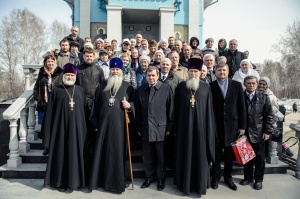 Храм в поселке Краснообск освящен в честь Казанской иконы Божией Матери. Владыка и Губернатор также осмотрели внутреннее убранство храма и встретились с общиной прихода. В интервью журналистам Владимир Филиппович отметил, что добрые отношения с Новосибирской Епархией укрепляются и на ближайшее время запланировано несколько совместных мероприятий. "Главное из них - Поезд "За духовное возрождение России", который отправится по Новосибирской области 15 апреля", - говорит Митрополит Новосибирский и Бердский Тихон.