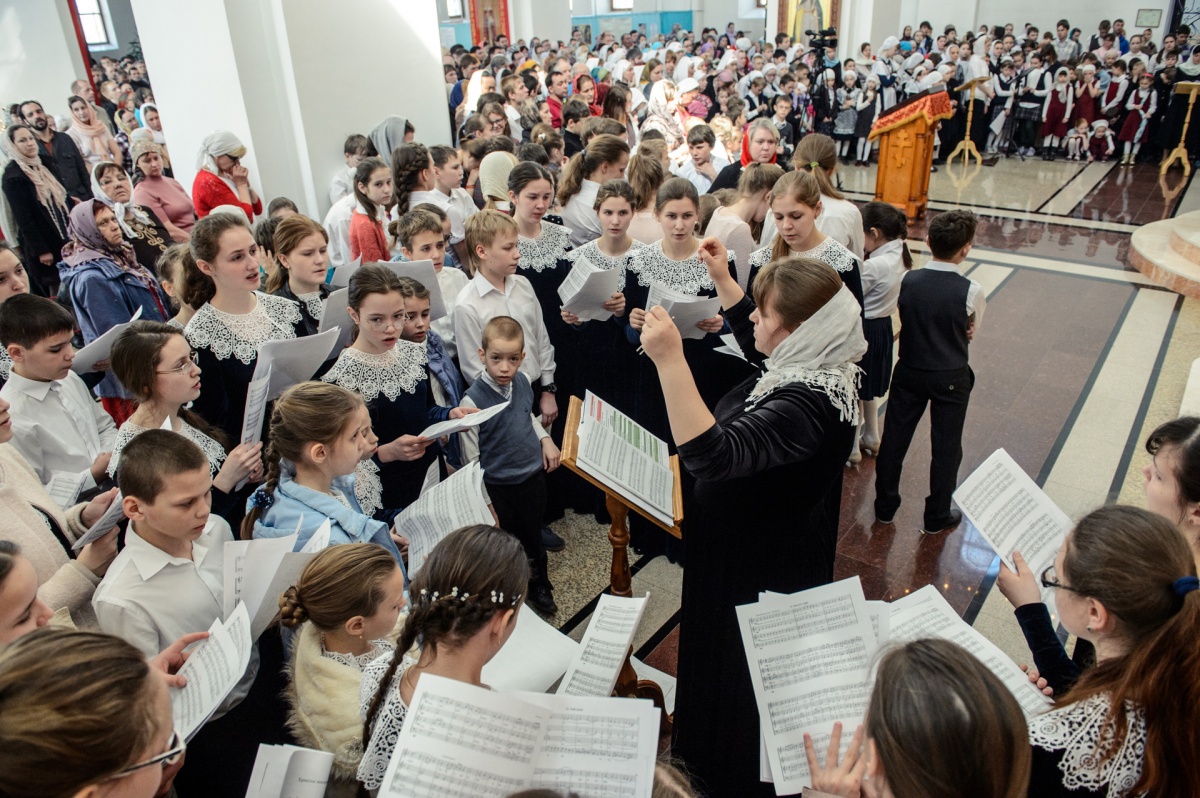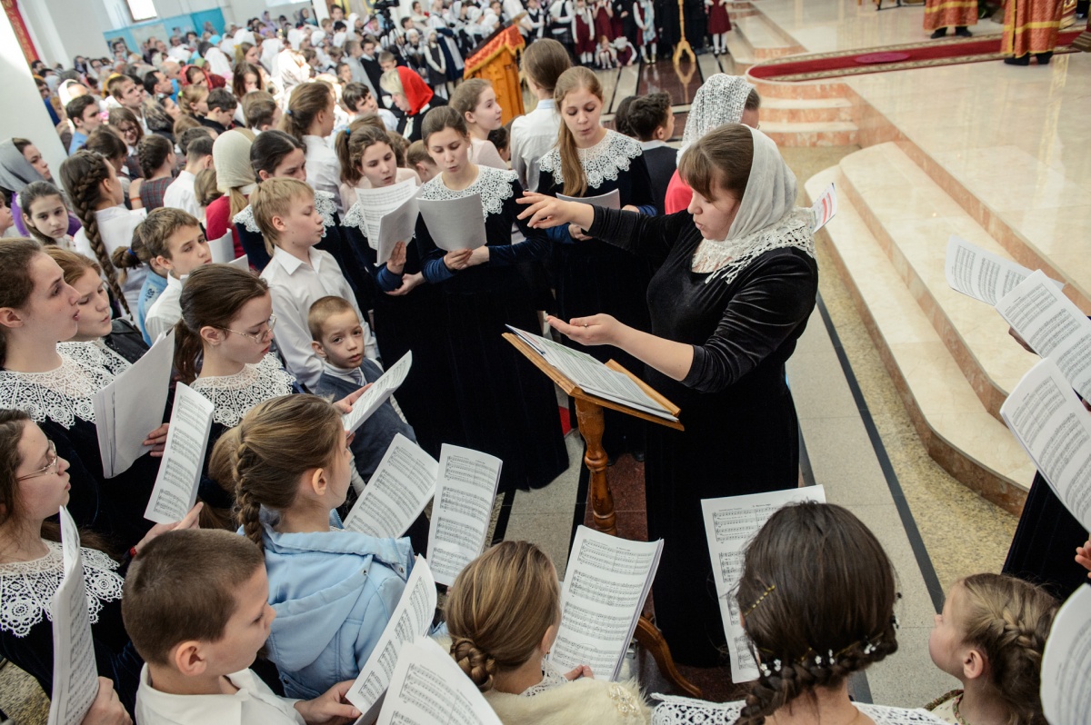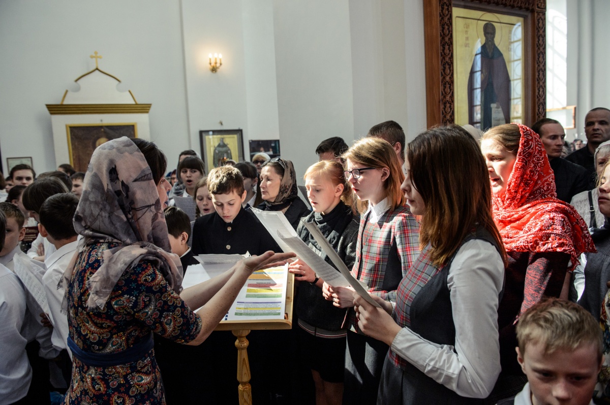 Дети встречали Владыку у дверей храма с хлебом-солью, сопроводили на второй этаж собора в храм во имя святого благоверного князя Владимира. Вся служба была разделена между шестью детскими хорами Вознесенского кафедрального собора, Гимназии во имя преподобного Серафима Саровского (г. Бердск), Гимназии во имя святого благоверного князя Владимира, Православной гимназии во имя Преподобного Сергия Радонежского (Академгородок), Православной гимназии во имя святых равноапостольных Кирилла и Мефодия, Гимназии во имя святителя Игнатия Брянчанинова. Они пели красиво и слажено.