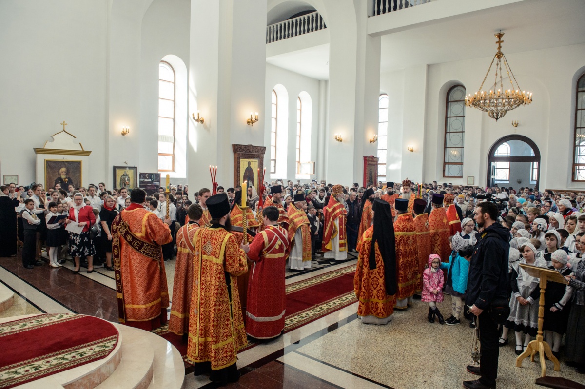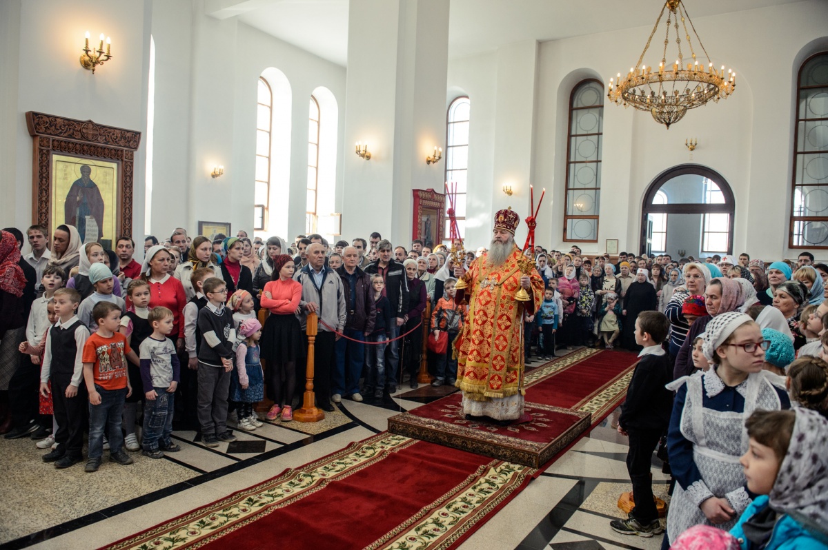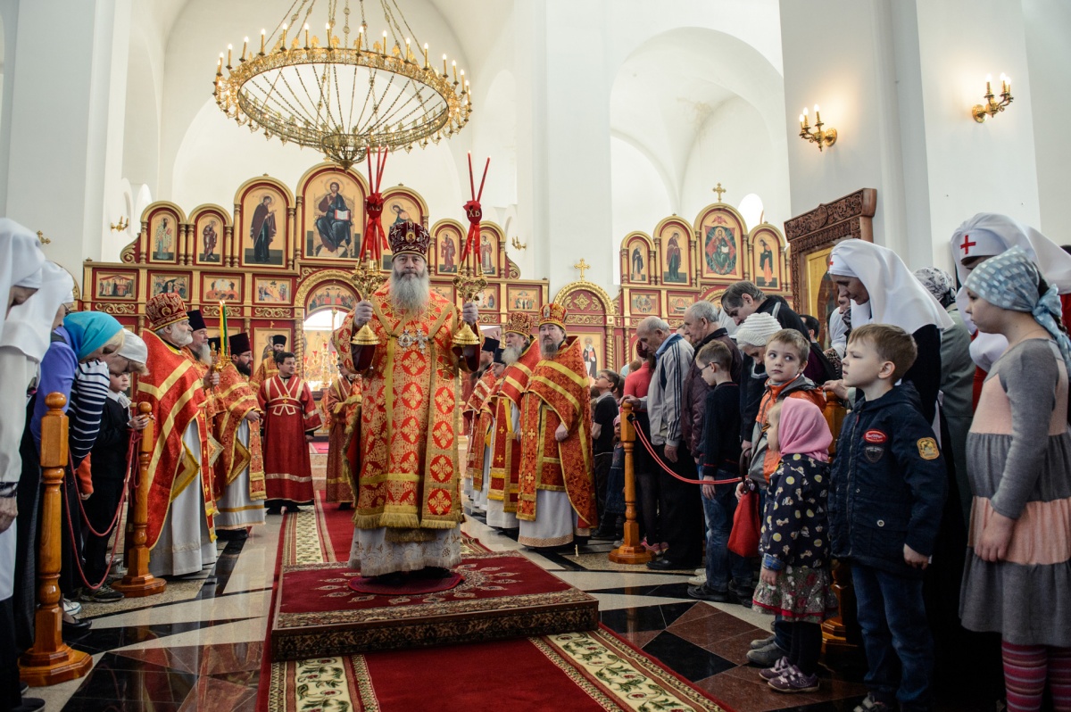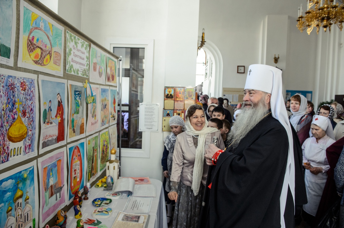 В приветственном слове Владыка Тихон поздравил прихожан и детей с Воскресением Христовым и днем памяти святых жен-мироносиц и сказал: «Сегодня мы вспоминаем святых жен-мироносиц, которые служили Христу и которые остались у Креста, не испугавшись притеснений со стороны иудеев. В этом году мы празднуем 70-летие Великой Победы нашего народа над фашистскими захватчиками и чтим память всех наших героев, погибших на полях сражения. Наши воины показали подвиг самопожертвования в Великой Отечественной войне. Большинство из них были крещеные, православные люди, воспитанные в царское время. У них мы учимся настоящей любви, заимствуем основы православного патриотизма — положить душу свою за друзей своих.