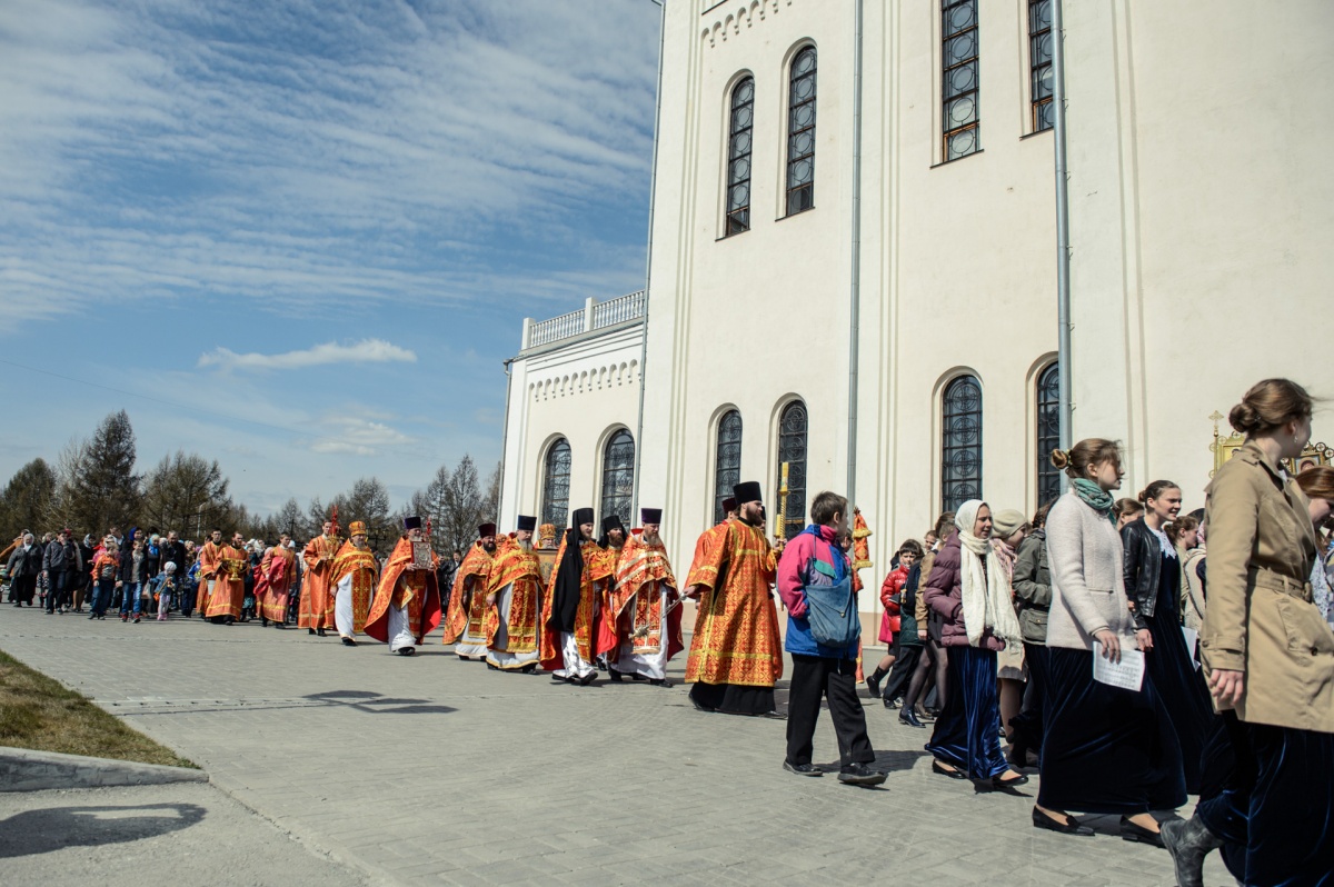 После службы духовенство, дети, народ вышли на крестный ход вокруг храма. Владыка с улыбкой на лице кропил людей святой водой. Окончание службы, молебен, проходили в нижнем храме в честь Святой Троицы. Настоятель храма игумен Павел (Григорьев) поздравил Митрополита с праздником, поблагодарил за проведение Литургии, постоянное попечение о монастыре, приходе, Гимназии во имя святого равноапостольного князя Владимира.