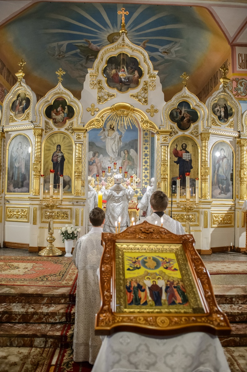 По окончании богослужения Митрополит Тихон поздравил клириков собора и прихожан с великим двунадесятым праздником Вознесения Господня и обратился к ним со словами проповеди. "В этот день заканчивается земной путь Иисуса Христа, который пришел на землю ради нашего спасения. Он показал, каким должен быть человек, чтобы последовать за Ним на небо. Святые отцы, устанавливая правила духовной жизни, руководствовались Евангелием, они воплотили его в жизнь, беря пример с Господа нашего Иисуса Христа. Действительно, если мы не будем ежедневно читать Евангелие, как мы будем иметь перед глазами пример Христа, как сможем любить Его? Особенно в этот день, когда Господь возносится на небо, когда побеждаются смерть и порок, нам нужно обратиться к началу нашего спасения - личности Христа".