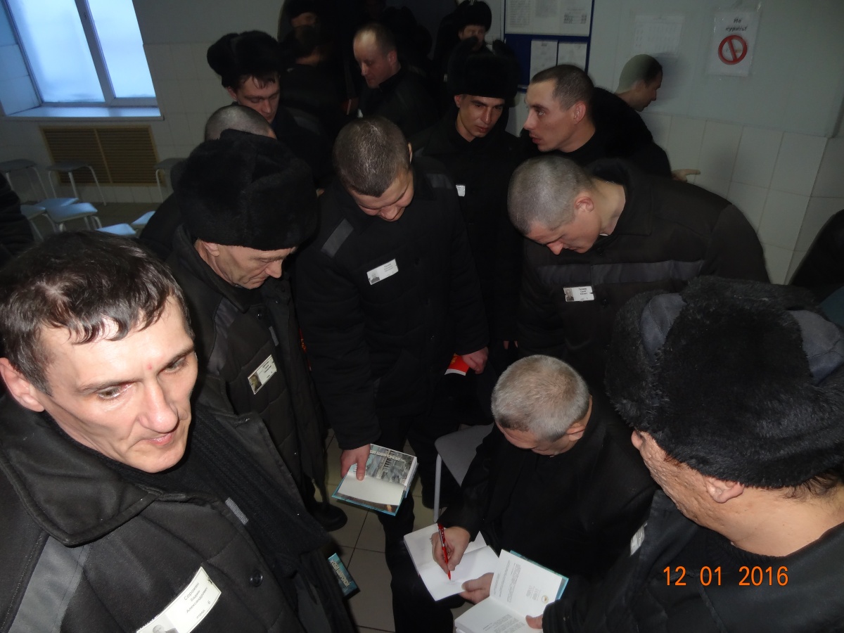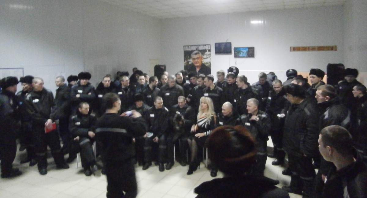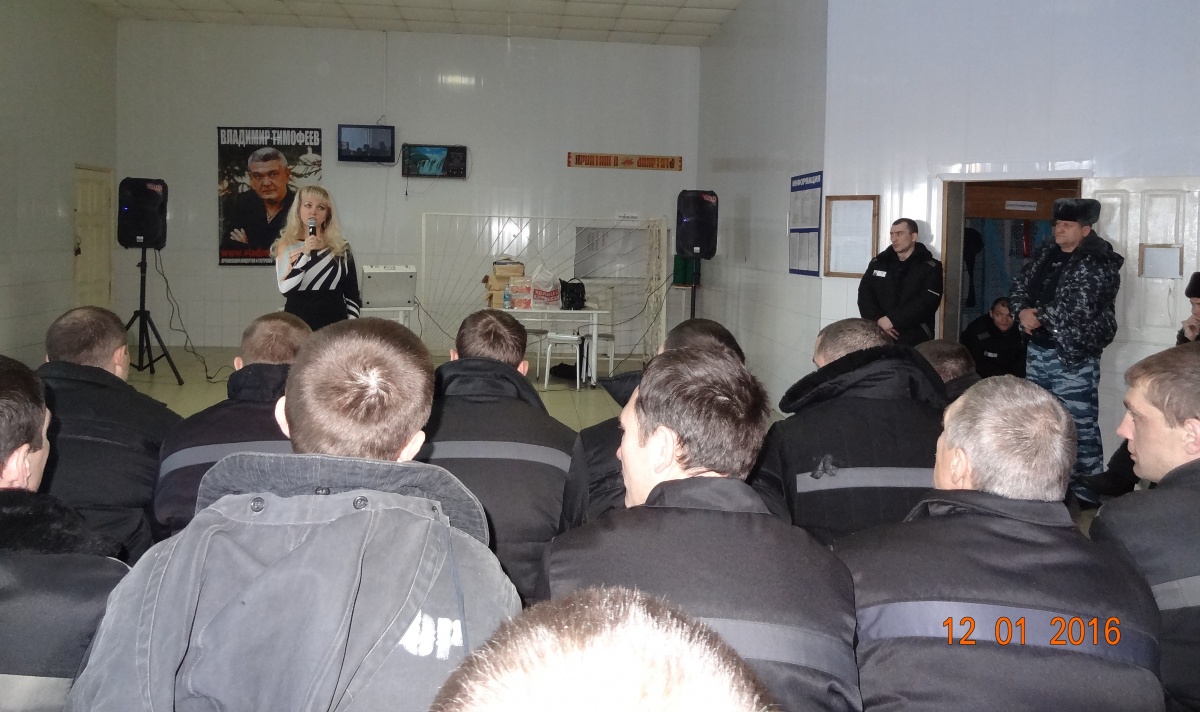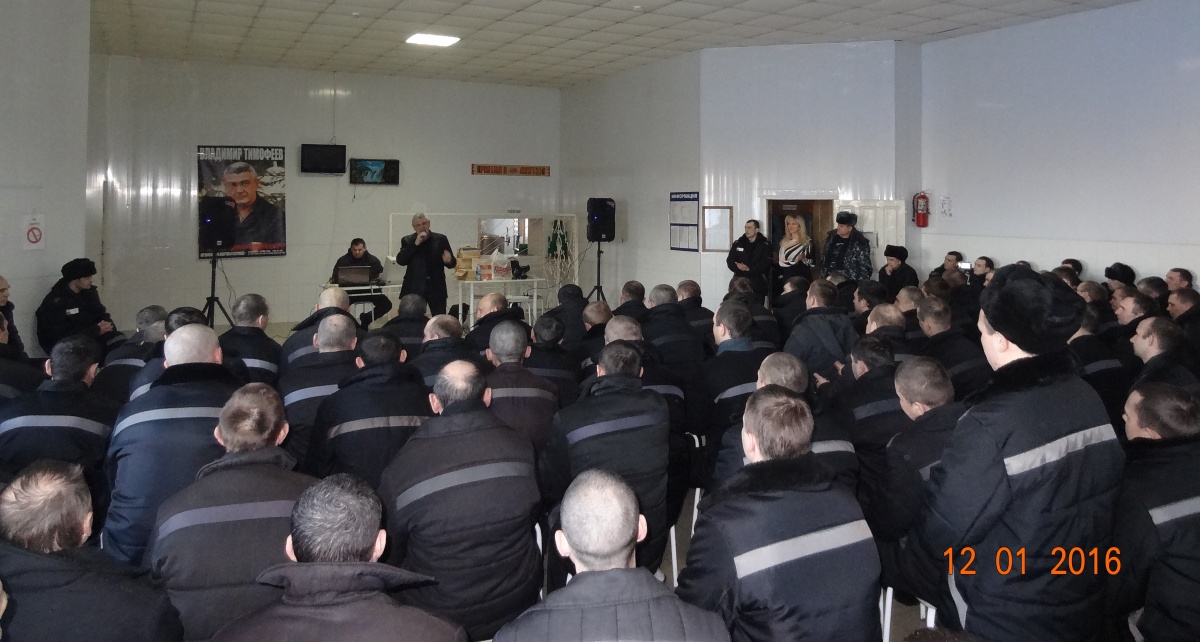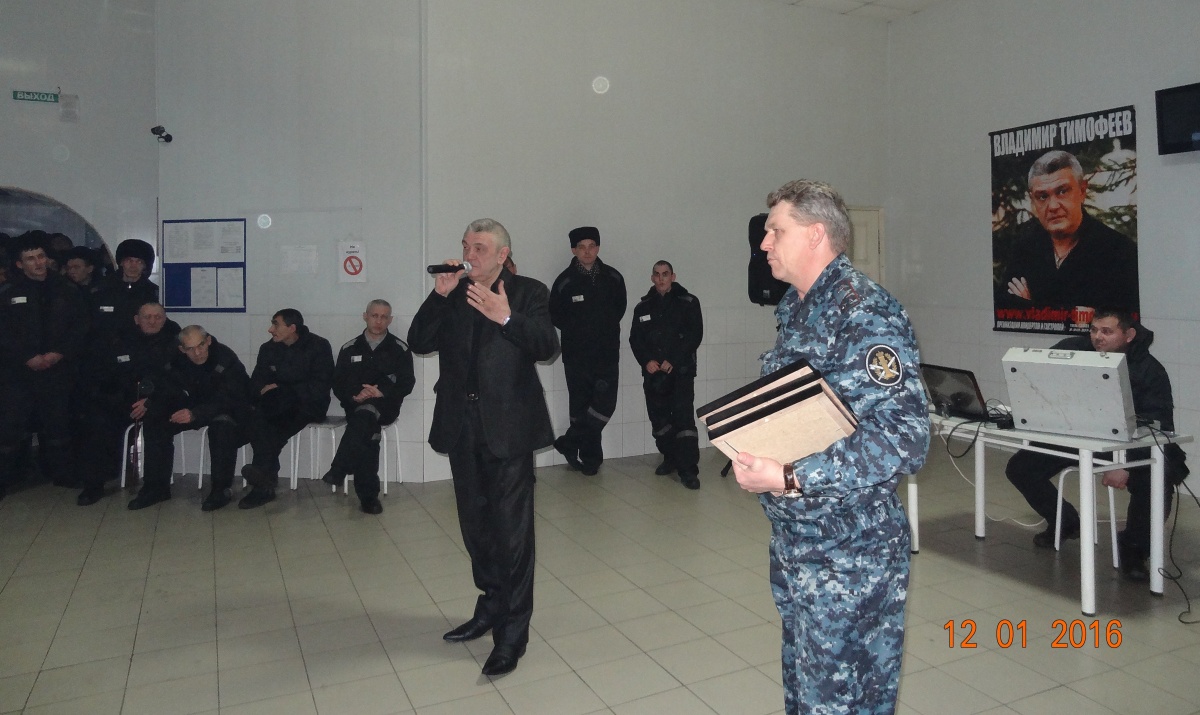 Владимир Тимофеев вновь выступил на сцене исправительного учреждения №21Владимир Тимофеев вновь выступил на сцене исправительного учреждения. Популярный Новосибирский автор-исполнитель в жанре «Русский шансон - городской романс» Владимир Тимофеев на этот раз посетил исправительную колонию №21 с концертной программой «В кругу друзей». Владимир родился в Новосибирске. Окончил лётное училище вертолётчиков. Пилот, офицер запаса, Музыкой увлекался с юных лет. Окончил музыкальную школу по классу баяна. В средней школе играл в местном ансамбле на гитаре. Свои песни начал писать с 1985 года. В 2004году на профессиональной студии «лиМУЗин» были записаны 2 песни для музыкального сборника. Эта работа дала положительный результат и песни имели большой успех. Так всё и началось. По словам Владимира, на творчество его вдохновляют друзья и жена Оля, она же и является его первым слушателем и критиком. В 2004 году Владимир организовал свою группу из единомышленников и профессиональных музыкантов «Чёрная роза». В 2005 году вышел первый сольный альбом «Жизнь - игра», который сразу заметили и оценили слушатели. В 2007 году вышел второй альбом «Моя гитара». В 2010 - «Я так скучаю по тебе''», а в 2012 году четвёртый альбом под названием « Грешу и каюсь». Где он уже выступил, как продюсер своего нового альбома. Многие из этих популярных песен он исполнил перед осужденными. Мероприятие прошло в рамках благотворительной акции «Давайте улыбнемся!», автором и руководителем которого является член общественного совета ГУФСИН России по Новосибирской области – Наталья Пендюрина. В этой акции Владимир Тимофеев участвует с 2009 года, а потому среди осужденных он пользуется популярностью. Побывать на концерте известного исполнителя смогли 300 человек, однако желающих было намного больше. Среди тех, кто побывал на концерте, были 3 осужденных, у которых, как оказалось, в этот день был День Рождения. Их лично поздравил Владимир Тимофеев, а Наталья Пендюрина вручила им подарки – подарочные альбомы о Новосибирске, блокноты и ручки. Стоит отметить, что Наталья никогда не приезжает в исправительные учреждения «с пустыми руками», она всегда дарит осужденным книги. И посещение ИК-21 не стало исключением – она вручила осужденным книги-альбомы по краеведению "Созвездие земляков", антологию "На берегах Оби широкой", книги с произведениями сибирских поэтов, а для храма учреждения – Библию и брошюры с материалами Русской православной Церкви. Осужденные в свою очередь поблагодарили гостей учреждения бурными аплодисментами, искренними улыбками и дорогим сердцу словом «спасибо». От имени начальника исправительной колонии №21 Георгий Смирнов, заместитель начальника ИК-21 ГУФСИН России по Новосибирской области, вручил всем выступающим благодарственные письма и картины, нарисованные осужденными.