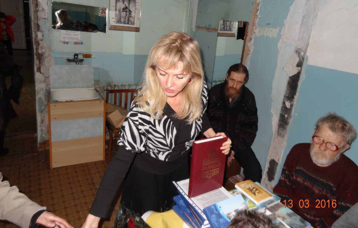 В ЕКЦ состоялась встреча с православной книгой «Священное, древнее, вечное» (+ видео)13 марта 2016 года, в учреждении Новосибирской Епархии Русской Православной Церкви «Комплексный центр социального обслуживания граждан, оставшихся без жилья» (Епархиальный комплексный центр) состоялась творческая встреча. ЕКЦ оказывает услуги и благотворительную помощь людям, попавшим в трудные жизненные ситуации, в т.ч. лицам без определенного места жительства и занятий, лицам законно находящимся на территории РФ (беженцы, вынужденные переселенцы и др.), а также гражданам без определенного места жительства, имеющим ограничения физиологической дееспособности (бездомным инвалидам).