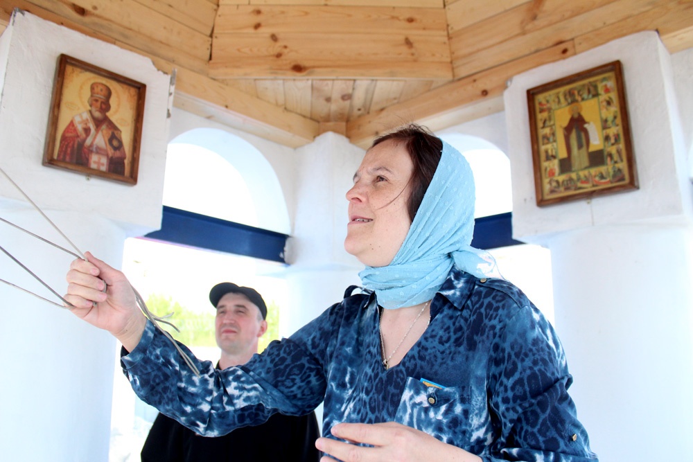 Звонарь Сретенского храма Алексей Хряков помогает бердчанке звонить в колокола. Фото Александры Ветровой.
