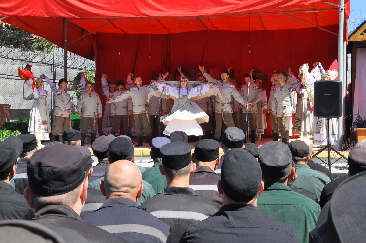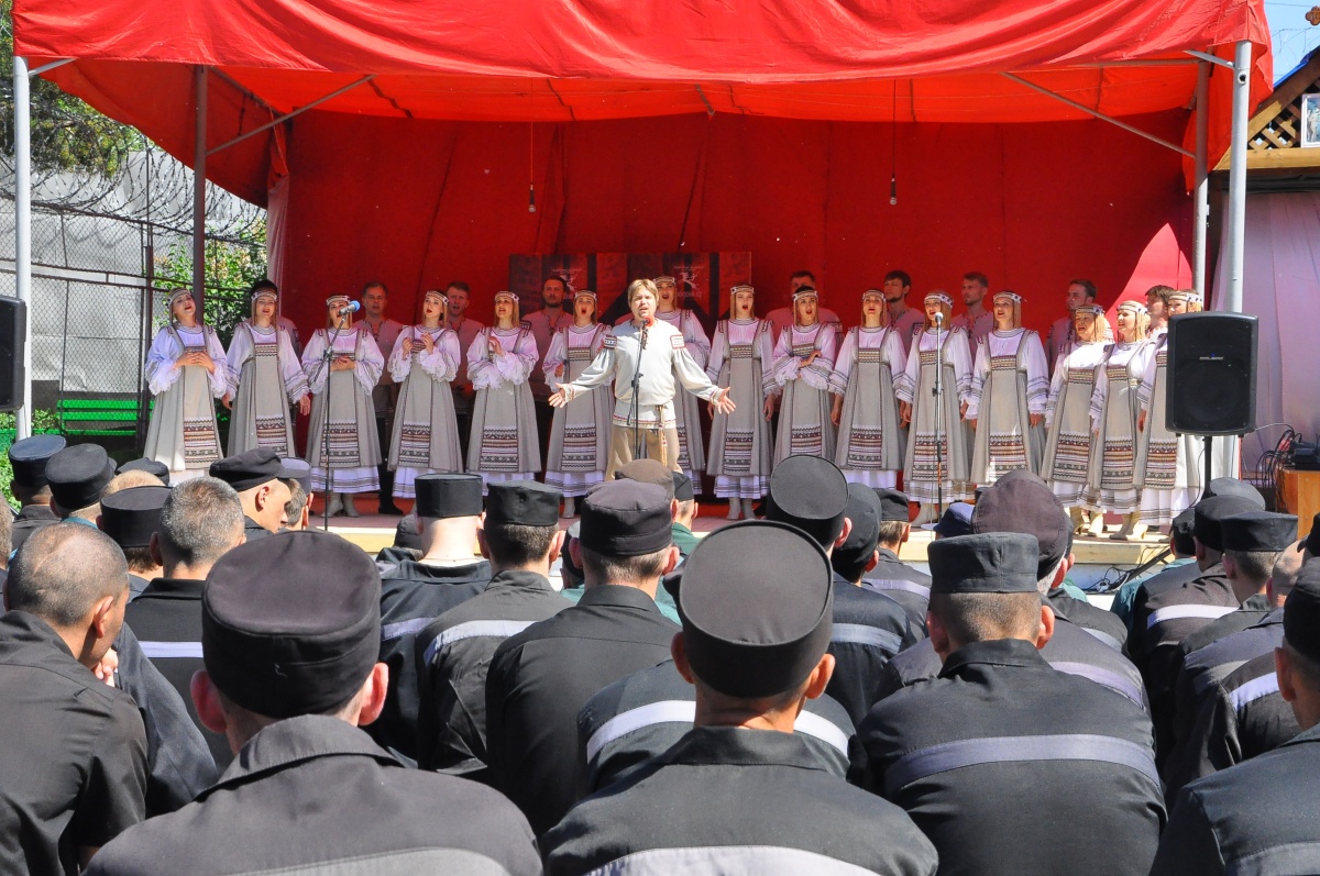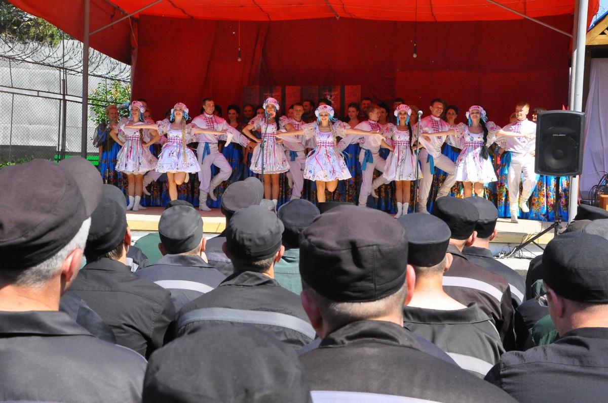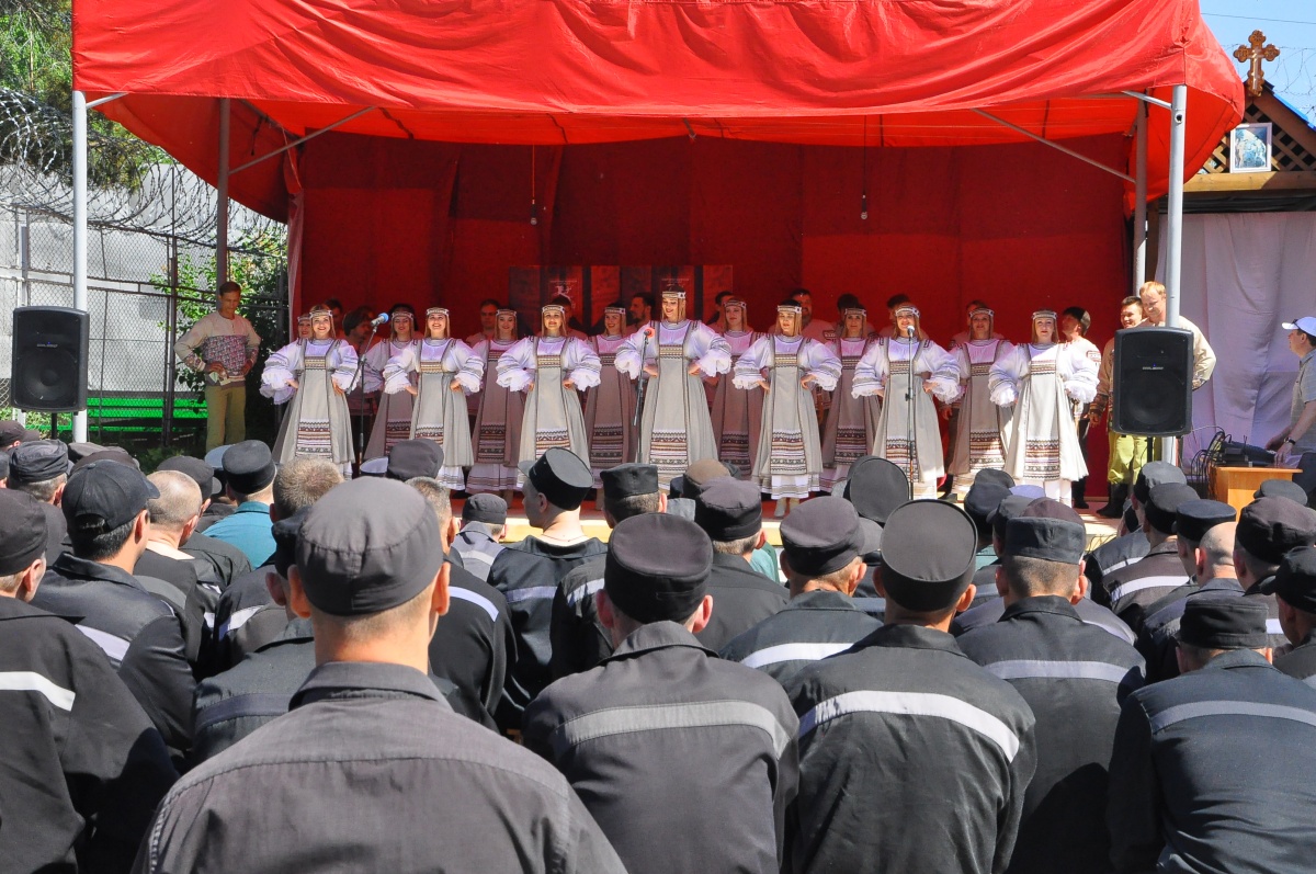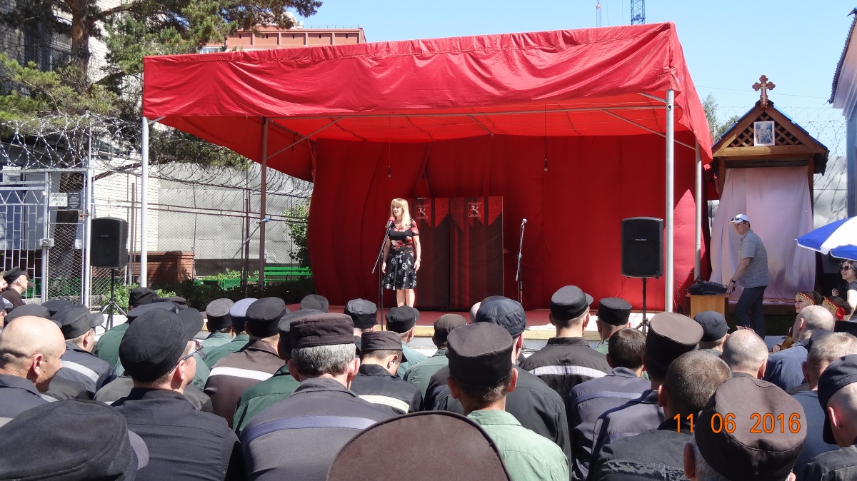 День России в колонии № 18 (+ фоторепортаж)В исправительной колонии строгого режима №18, выступил Государственный академический Сибирский русский народный хор. Коллектив выступает в колонии уже во второй раз. В 2015г., хор принимал участие в благотворительной акции «Давайте улыбнемся!». Директор Сибирского хора, заслуженный работник культуры РФ - Екатерина Федоровна Ковалева- человек талантливый, и неравнодушный. В прошлом году, после концерта, со сцены пообещала зрителям, что коллектив приедет с новой программой еще раз и слово сдержала. Коллектив, полным составом приехал! И блистательно выступил перед осужденными. Концерт проходил на открытой площадке, специально построенной сцене. На плацу разместилось более трехсот зрителей, несколько отрядов, смотрели концерт из окон своих бараков, остальные смогли увидеть концерт по местному кабельному телевидению. Яркий, наполненный жизнью, светом, радостью концерт, был приурочен к празднованию Дня России, поэтому в репертуаре прозвучало много патриотических песен. И все они были пронизаны любовью к дому, к жизни, любовью к Родине! Государственный академический Сибирский русский народный хор является одним из ведущих профессиональных коллективов русской традиционной культуры России. В его состав входит 80 профессиональных артистов. 40 артистов - вокалистов со специальным профессиональным образованием, 24-танцора балета, работают в жанре русского традиционного искусства, используя достижения современной хореографии и 16 музыкантов в оркестре, помимо аккомпанирующей роли, исполняют отдельные концертные программы. Коллектив был создан в преддверии Победы Советского народа над фашистской Германией 19 апреля 1944 года, как Сибирский Ансамбль песни и пляски. Основатель и первый художественный руководитель Николай Петрович Корольков, 1944-1953г.г. В 2014 году, творческий коллектив вошел в состав Союза российских национальных (народных) профессиональных творческих коллективов России. Как говорит Екатерина Ковалева: « Мы делаем русское традиционное искусство модным, интересным и престижным, сохраняя его самобытность, создавая высокохудожественный конкурентоспособный творческий продукт, адаптированный к сознанию современного зрителя. В апреле этого года состоялась премьера программы «Сердцем наполненный взгляд..», в основе которой лежит творчество великого русского поэта Сергея Есенина. Мы не могли не поделиться своим творческим успехом с осужденными. Концерт в честь Дня России – не случаен. Искусство культивирует духовность – основополагающую суть нашей нации. Коллектив хочет знакомить осужденных с русским национальным искусством, потому что оно очень мотивационно. Это вековое искусство, оно нравственно и заставляет задуматься об оценке собственных действий, мотивирует к пониманию того, что такое мир и, что ты должен сделать для этого мира. Мы хотим напомнить им, что за колючей проволокой есть жизнь – яркая и эмоционально сильная. Мы должны гордиться своей страной и сохранять национальное культурное наследие!» Выступление Сибирского хора, как и в прошлом году, прошло с большим успехом и при полном аншлаге. По милости Божией, на территории колонии №18, руками осужденных, построен прекрасный Храм Владимирской иконы Божией Матери. И даже, те, кто еще не посещает богослужения, каждый д