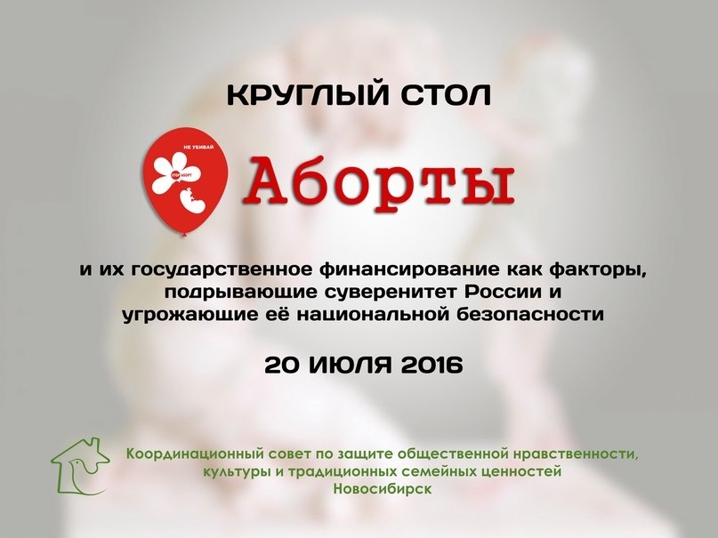 Резолюция круглого стола «Аборты и их государственное финансирование как факторы, подрывающие суверенитет России и угрожающие её национальной безопасности»20 июля 2016 года в Новосибирске состоялся круглый стол «Аборты и их государственное финансирование как факторы, подрывающие суверенитет России и угрожающие её национальной безопасности».