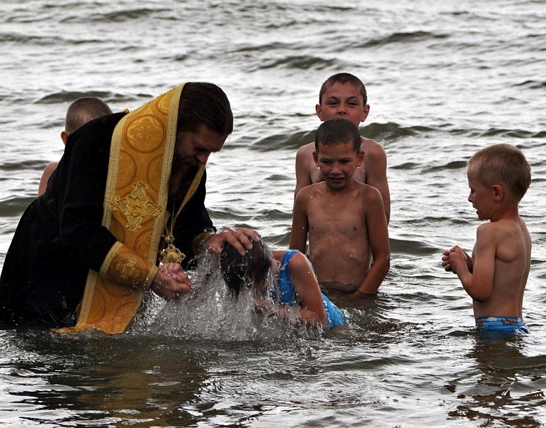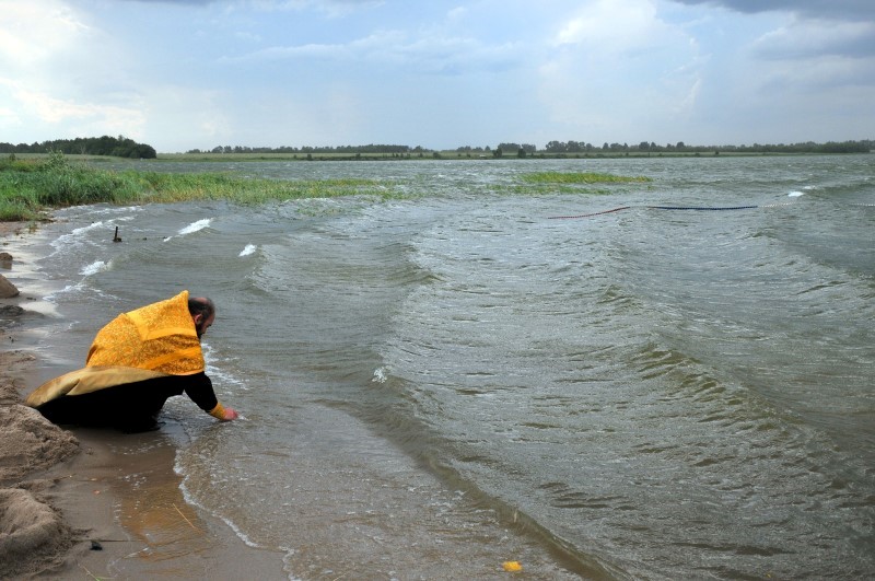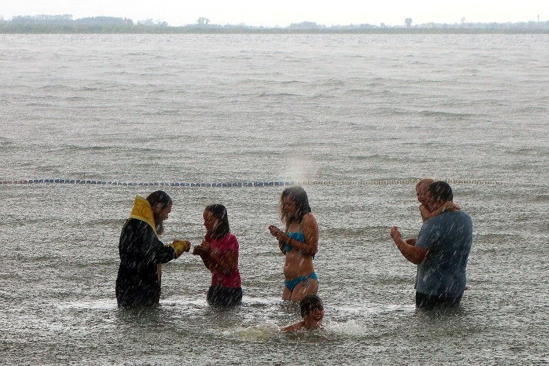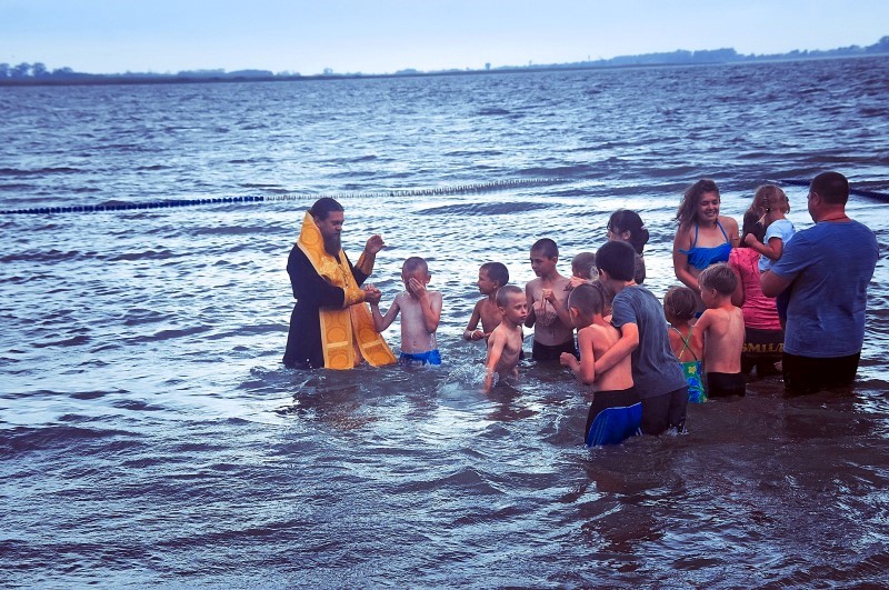 И что удивительно, в этот день стояла жаркая погода, на градуснике было +35 градусов по Цельсию, но как только Владыка вошел в воду и начал совершать Таинство Крещения, на небе сразу появилась огромная серая туча, все небо стало мрачным и полил проливной дождь. Причем лил, не переставая до тех пор, пока не вышел из воды вместе с Владыкой последний крещаемый ребенок, т. е. пока не закончилось само Таинство.