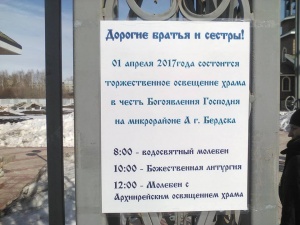 Освящение храма Богоявления Господня в Бердске1 апреля 2017 года в день похвалы Пресвятой Богородицы состоялось освящение Богоявленского собора, которое совершил Митрополит Бердский и Новосибирский Тихон.