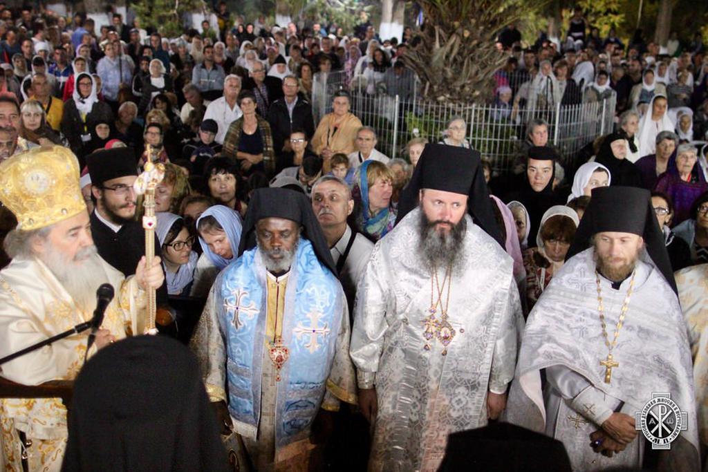 Палестины Феофилом III.Его Блаженству сослужили митрополит Вострский Тимофей, представитель Святогробского братства на Кипре, гость из Александрийского Патриархата архиепископ Муанзский Иероним (Танзания), генеральный секретарь Священного Синода Иерусалимской Православной Церкви архиепископ Константинский Аристарх, епископ Каинский и Барабинский Феодосий (Московский Патриархат), Начальник Русской Духовной Миссии в Иерусалиме архимандрит Александр (Елисов), а также сонм духовенства. Молитвословия и тексты Священного Писания произносились на греческом, арабском, славянском и румынском языках. По окончании богослужения Предстоятель Иерусалимской Православной Церкви обратился к многотысячному собранию со словом приветствия. Пресс-служба Русской Духовной Миссии