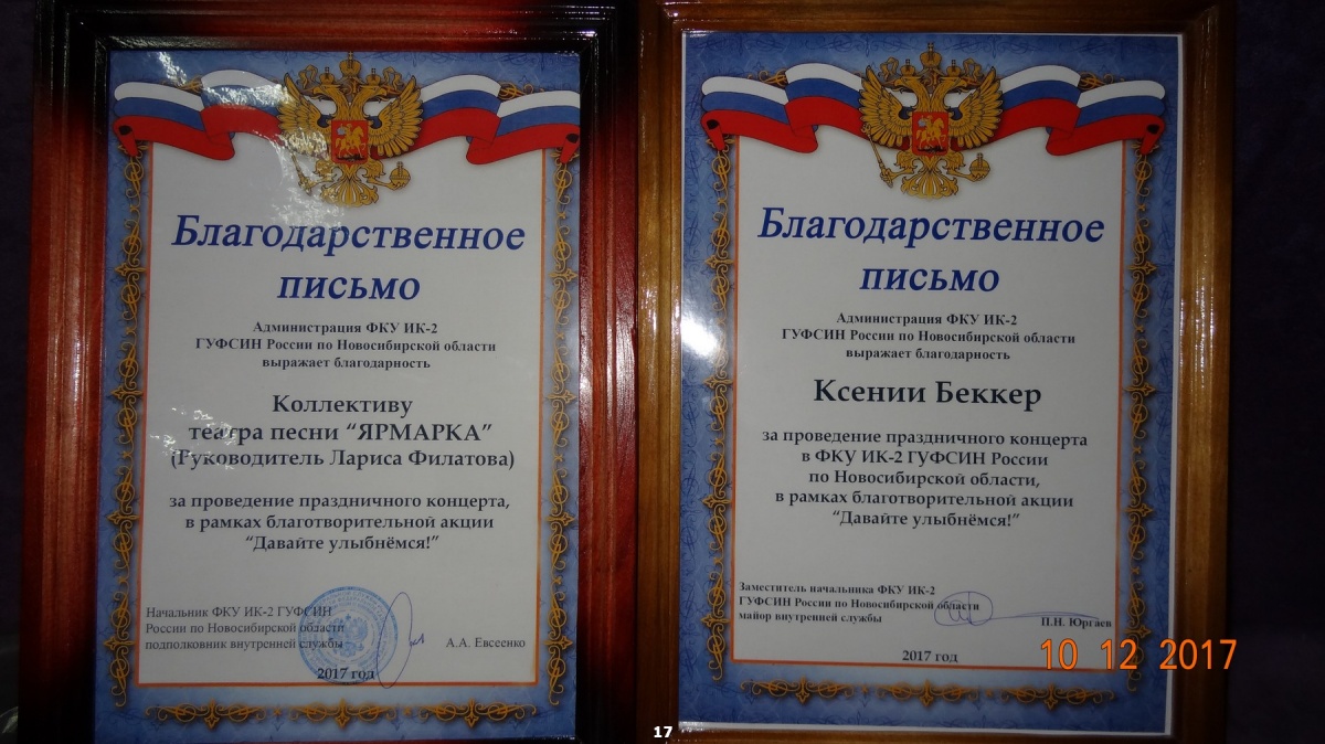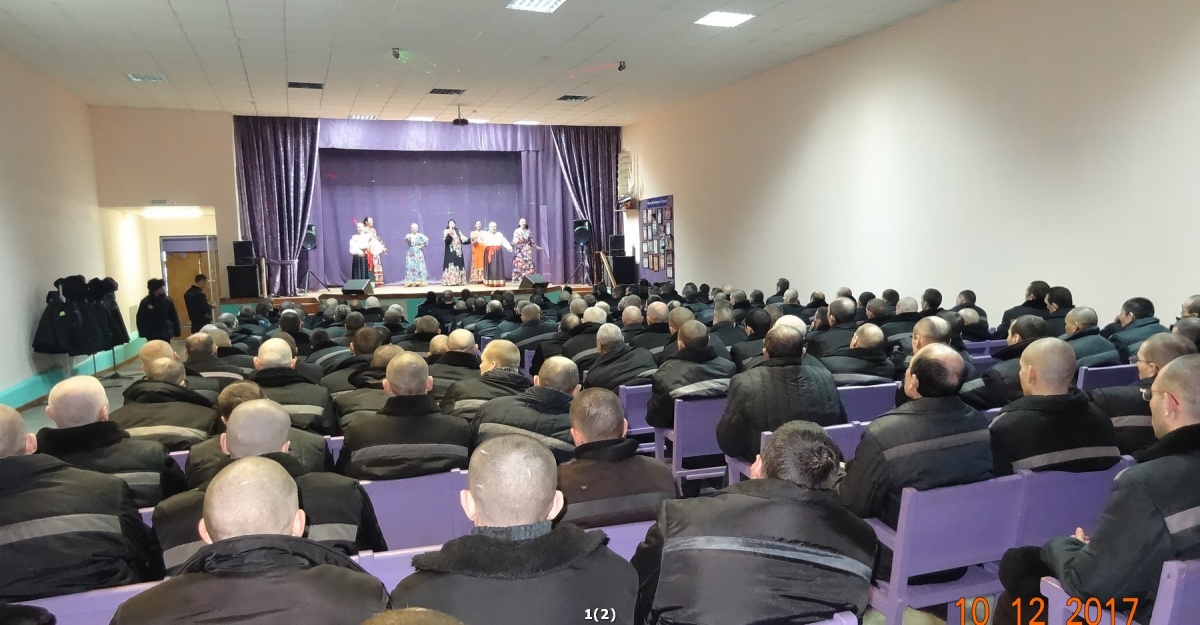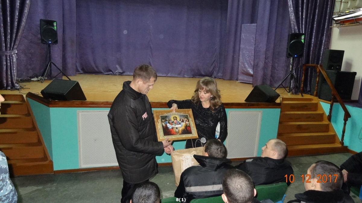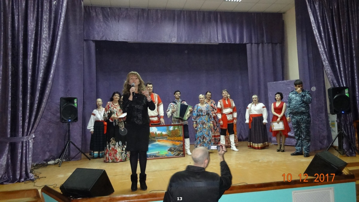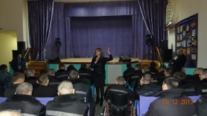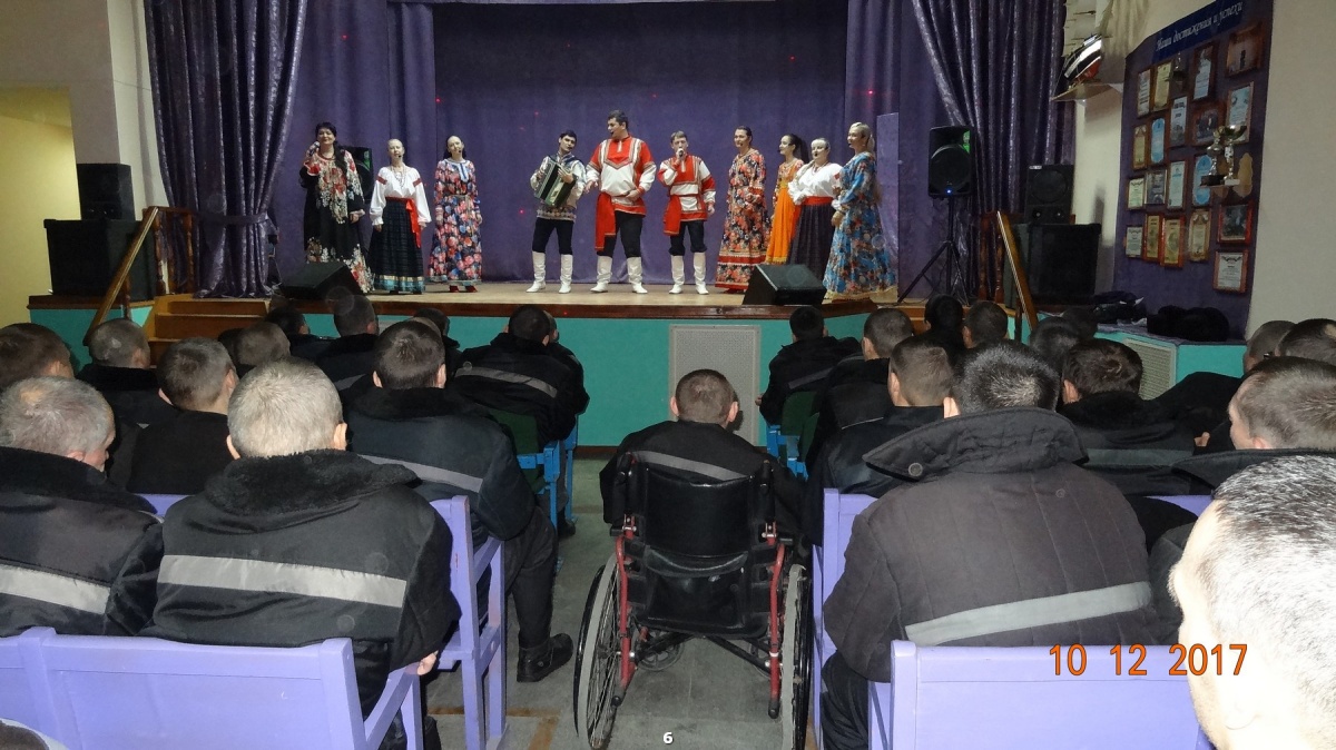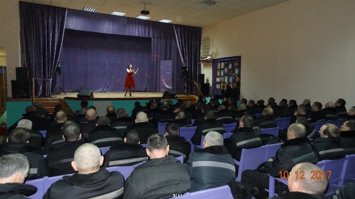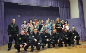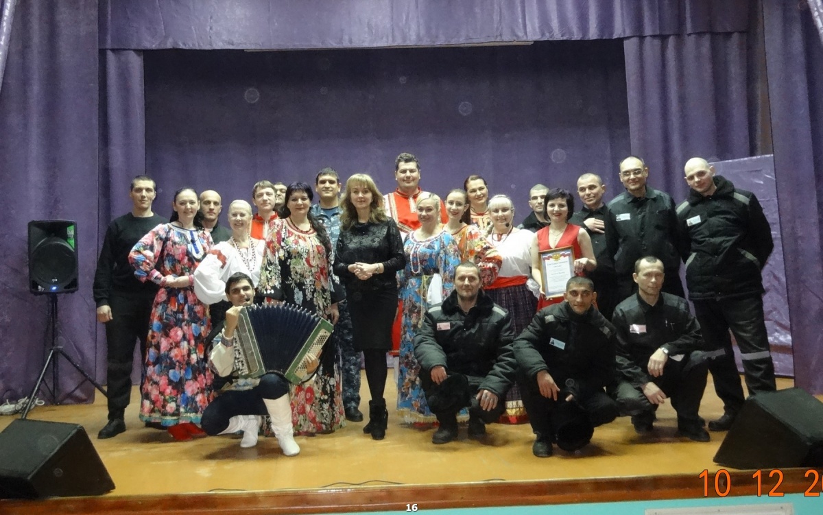 В исправительной колонии № 2 выступил Театр песни "Ярмарка"10 декабря 2017 года, в ФКУ ИК -2 ГУФСИН России по Новосибирской области, прошел концерт Театра песни «Ярмарка» под руководством Ларисы Филатовой. Мероприятие прошло в рамках благотворительной акции «Давайте улыбнемся!» Акция проходит в исправительных учреждениях десять лет и имеет большой резонанс среди городской общественности. Некоторые деятели культуры, и творческие коллективы, уже не по одному разу приезжали в исправительные учреждения с концертами и театрализованными представлениями. Театр песни «Ярмарка» - лауреат Всероссийского фестиваля «В гостях у Шукшина», призер Гран-при Международного фестиваля «Прииртышские напевы» ( г.Семей), участник духовно-просветительской акции "Поезд "За духовное возрождение России", дипломант Межрегионального фестиваля "Деревенька. Сибирь", коллектив известен не только жителям г.Новосибирска, но и далеко за его пределами . Особенностью коллектива является соединение в творчестве элементов традиционного народного исполнительства и современных направлений. Оригинальное прочтение произведений народного музыкального искусства, яркие авторские работы дают театру песни возможность звучать актуально и стильно, задор и кураж исполнителей поднимают настроение и дарят яркие эмоции. Репертуар «Ярмарки» разнообразен, словно разноцветная ярмарочная карусель, от веселой, разбитной народной песни до народной песни в современной трактовке, авторской песни и ретро-шлягера в современной обработке. В исправительной колонии № 2, концертная программа Театра-песни «Ярмарка», была посвящена 80-летию Новосибирской области. Прозвучали песни о Сибирских бескрайних просторах и людях живущих на этой земле. В праздничном концерте приняла участие лауреат областных конкурсов, член клуба авторов Новосибирской областной организации «Общество книголюбов» Ксения Беккер. Ксения участвует в масштабных культурно-просветительских мероприятиях, благотворительных концертах и является координатором нового проекта организации. Концерт прошел на одном дыхании, около трехсот осужденных приняли активное участие в мероприятии, аплодировали, благодарили исполнителей, просили приехать к ним еще. Заместитель начальника исправительного учреждения Павел Юргаев, вручил артистам благодарственные письма и подарок на память сделанный руками осужденных. По окончании встречи, как обычно последовало фото на память для всех желающих. член союза журналистов РФ Наталия Пендюрина-Капина