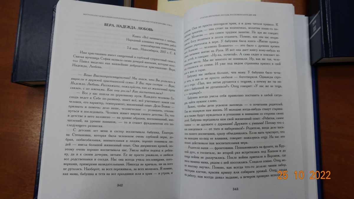 Во втором томе сборника (С.342-347) есть статья Т.В. Пендюриной - «Вера. Надежда. Любовь». Рассказ о дружной, христианской семье Владыки Тихона. http://www.orthedu.ru/eparh/11334-slovo-arhipastyrja-vera-nadezhda-ljubov.html Татьяна Викторовна Пендюрина руководила «Новосибирским обществом книголюбов» почти сорок лет. И для нас, «Новосибирских книголюбов», двойная радость и честь читать сборник проповеднических трудов, нашего дорогого и любимого духовного наставника Владыки Тихона. В завершении заседания, председатель издательского отдела Новосибирской епархии, настоятель храма в честь Преподобных отцов Киево-Печерских, иерей Александр Приходько, рассказал авторам о чуде обретения Иверской иконы Божией Матери, раздал новый выпуск епархиального издания «Вестник Новосибирской Митрополии» и ответил на многочисленные вопросы. Затем работал «Открытый микрофон» и как всегда звучали стихи. член союза журналистов РФ, руководитель «Новосибирского общества книголюбов» Н.Пендюрина-Капина .