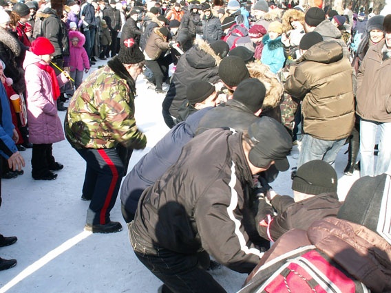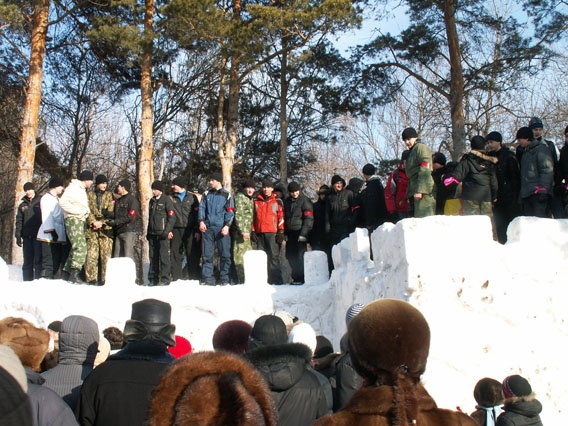 Искитимские богатыри на масленицеСила Искитимской земли – в единстве. 6 марта 2011 года от Рождества Христова в г. Искитиме, по благословению настоятеля храма в честь Владимирской иконы Божией Матери, иерея Кирилла Портнягина, состоялся областной праздник народной традиционной культуры «Широкая масленица». Для участия в его военно-спортивной части, по приглашению содружества патриотических клубов г. Искитима и Искитимского района «Отдельный детский Сибирский казачий дивизион», прибыли профильные клубы: из района – «МЧС-Тальменка» (с. Тальменка, руководитель – С.А.Глибин), «Защитник» (п. Керамкомбинат, С.А.Попов), «Орлята» (д. Старый Искитим, В.Н.Васильев), «Ракетчик» (ст. Евсино, Л.М.Поломошнов), «Тополь» (ст. Евсино, Д.Г.Жукова), из Искитима – «Родина» (В.Е.Баженов), «Сибирский пластун» (Л.М.Усольцев), «Разведчик» (А.И.Оборкин), искитимская команда «Федерации русского боевого искусства (РОСС) по Новосибирской области» (президент федерации – В.Ю.Власов), ролевой клуб исторической реконструкции «Зов предков» (А.П.Шведов). Общая численность объединённого отряда искитимских курсантов, кадет, спортсменов, реконструкторов и молодых казаков составила около 150 человек. К сожалению, ввиду того, что клубы из других районов области к началу спортивной программы ретировались в родные пенаты или «растворились в толпе зрителей», искитимцам пришлось противостоять друг другу во всех видах молодецких забав, кулачных и стеношных боях, фехтовальных поединках. После того как ведущий объявил о начале приступа к снежному городку, трёхметровые стены «крепости» быстро заняла дружина искитимских богатырей. Но оргкомитет праздника не смог выставить «осадную армию», и после пятиминутной демонстрации штурма силами самих же искитимцев чучело «Масленицы» было передано непобеждёнными защитниками на сожжение. Закончились военные игры в прощеное воскресенье традиционной «братиной», пущенной по кругу. В.Е.Баженов и кадеты клуба Родина Воевода и Масленица Желающих биться с искитимцами на стенах крепости не нашлось Курсанты клуба Защитник. Справа - С.А.Попов Отец Кирилл Портнягин Перетягивание каната Прыжки в мешках Русская борьба на поясах Стеношный бой ![]() А приз так близок