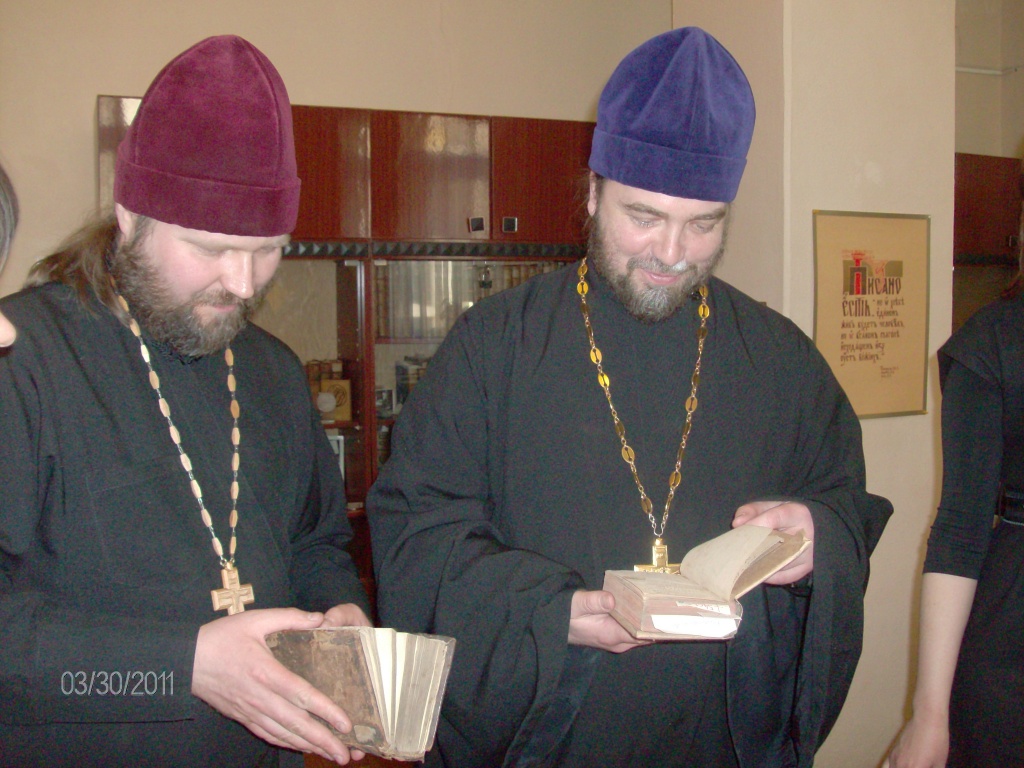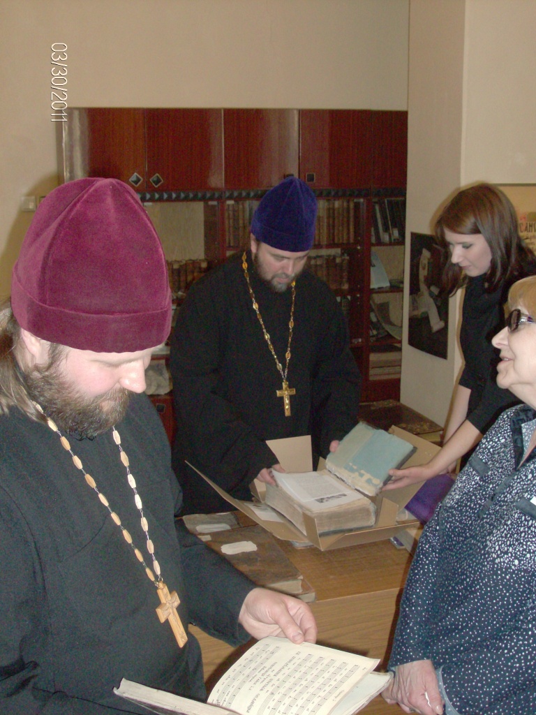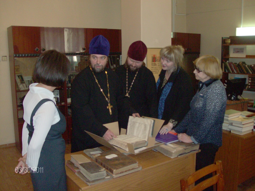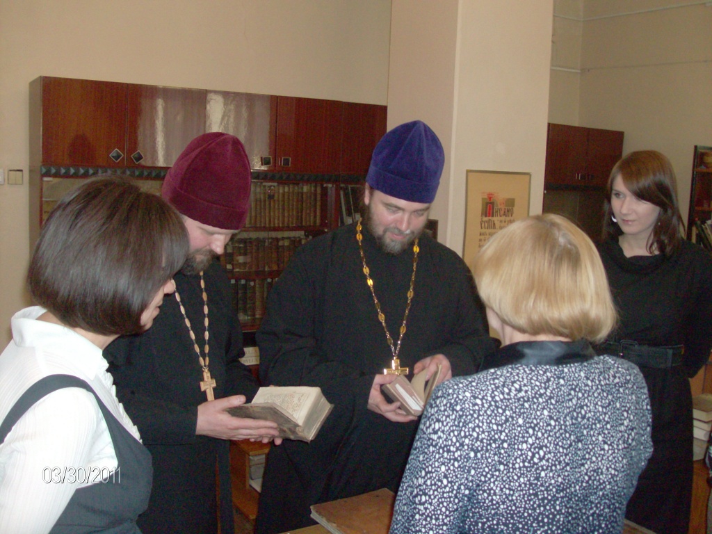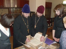 В рамках встречи обсудили прошедшее празднование Дня российской печатной православной книги, который отмечается 1 марта, начиная с 2010 года. Для гостей была проведена экскурсия в Отдел ценной и редкой книги, где сотрудники отдела познакомили их с ценными изданиями из фонда библиотеки, а также основными экспонатами выставки "Российская печатная православная книга: от истоков к современности", которая проходила в библиотеке с 4 по 20 марта и была приурочена к знаменательному дню. На выставке были представлены: "Библия" 1757 года издания, "Евангелие напрестольное" 1763 г., "Апостол" 1891 г., факсимильное издание "Острожской Азбуки" Ивана Федорова 1578 г., "Минеи" XVIII в., "Святцы" 1741 г. и многие другие памятники русской печати, а так же современные электронные издания и академические труды по древнерусской литературе. По итогам встречи был заключен устный договор о сотрудничестве между Новосибирской государственной областной научной библиотекой и Издательским Советом Новосибирской Епархии.