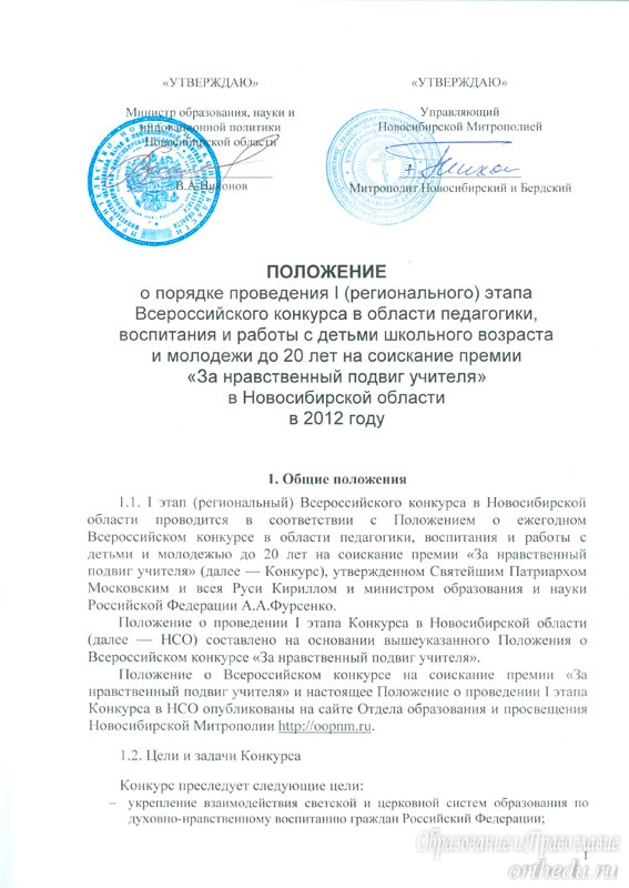 Положение о порядке проведения I (регионального) этапа Всероссийского конкурса в области педагогики, воспитания и работы с детьми школьного возраста и молодежи до 20 лет на соискание премии «За нравственный подвиг учителя» в Новосибирской области в 2012 г