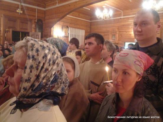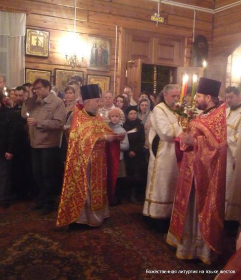 «Христос воскресе!», - троекратно повторяет священник с амвона. Для того чтобы понять эти спасительные слова никакой перевод нам не нужен. Но чтобы нам было спокойно, чтобы мы могли осознанно принять участие в службе вместе со всеми, находящимися в храме, наш переводчик на жестах «повторяет»: «Христос воскресе!», и мы, все неслышащие «едиными устами и единым сердцем» отвечаем – «Воистину воскресе!». «Христос воскресе из мертвых, смертию смерть поправ и сущим во гробех живот даровав», - поем мы вместе со всеми. И наши молитвы объединяются с молитвами слышащих и победным пением возносятся к Небу, к Тому, Кто победил смерть, Кто здесь сейчас рядом с нами. Сегодня здесь мы стоим не отдельно слышащие и не слышащие, а стоят теперь здесь души людей, очищенные, просветленные, составляющие собой единое целое, - Тело Христово. Улыбки сами собой расплываются на лицах. Позади нелегкое время Великого Поста. А сегодня… Сегодня – свершилось… Всё, Победа! Дожили. Христос Воскрес! И дышится сегодня по-другому, легче и молитвы сегодня чище, сильнее. Радость! Словами не описать… К середине службы ноги тяжелеют. Но глазами стараюсь поймать каждый жест нашего переводчика, чтобы ничего не пропустить, чтобы молиться усерднее. И вот снова в победной песне поднимаются наши руки: «Христос воскресе из мертвых...».