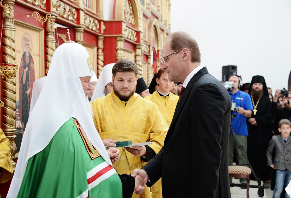 Во внимание к трудам на благо Церкви и Отечества Святейший Патриарх Кирилл наградил губернатора Новосибирской области В.А. Юрченко орденом преподобного Сергия Радонежского II степени, председателя Законодательного собрания Новосибирской области И.Г. Мороза орденом святого благоверного князя Даниила Московского III степени, мэра г. Новосибирска В.Ф. Городецкого орденом «Славы и чести» III степени.