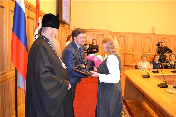 Победителям областного этапа конкурса "За нравственный подвиг учителя" вручены наградыПочетные награды учителям вручили заместитель министра образования, науки и инновационной политики Новосибирской области Дмитрий Метелкин и митрополит Новосибирский и Бердский Тихон. «Уже не первый год вместе с Новосибирской митрополией Русской Православной Церкви мы чествуем педагогов, которые ставят себе задачу не только обучать предмету, но учить нравственности, основам традиционной, в том числе православной, русской культуры, — отметил Дмитрий Метелкин. — Образцы профессионального мастерства, отмеченные на конкурсе, могут служить ориентиром для огромного количества педагогов, работающих в системе образования». В Новосибирской области конкурс «За нравственный подвиг учителя» проводится в седьмой раз. Дважды — в 2007 и 2011 годах наш регион являлся центром межрегионального этапа Всероссийского конкурса по Сибирскому Федеральному округу. В этом году участниками областного этапа конкурса в 6 номинациях стали 52 педагога. Образцы профессионального мастерства, отмеченные на конкурсе, могут служить ориентиром для огромного количества педагогов, работающих в системе образования, — отметил Дмитрий Метелкин По результатам конкурса победителем в номинации «Лучшая инновационная разработка года» стал проект «Родное слово» (учебное пособие «Основы православной культуры» для 5 класса) учителя истории Православной Гимназии во имя Преподобного Сергия Радонежского Протоиерея Бориса Пивоварова. В номинации «Лучшее педагогическое исследование года» победила учитель истории и обществоведения Информационно-экономического лицея Евгения Кривченко («Публикации по истории Новосибирской области за период 1957-2011 годов и возможность их использования во внеклассной работе со школьниками»). В номинации «Лучший издательский проект года» лучшей стала зам. директора по УВР Гимназии №13 Татьяна Кравец (проект «Здравствуй, Новосибирск» — рабочая тетрадь для учащихся 1-го класса). Учитель воскресной школы прихода во имя Архистратига Михаила р.п. Коченево Зоя Кривошапова заняла первое место в номинации «Лучшая программа духовно-нравственного воспитания детей и молодёжи» (проект «Духовный мир сказки или введение в христианскую нравственность»). Воспитатель дошкольного отделения Православной Гимназии во имя Преподобного Сергия Радонежского Марина Баженова победила в номинации «Лучшая программа гражданско-патриотического воспитания детей и молодёжи» (проект «Страницы Отечественной истории для дошкольников и учащихся младших классов»). В номинации «За организацию духовно-нравственного воспитания в рамках образовательного учреждения» победила учитель русского языка и литературы Новосибирской классической гимназии №17 Людмила Яковлева (проект Краеведческий музей «У истоков города» как центр духовно-нравственного и патриотического воспитания учащихся»). Работы победителей областного этапа направлены для участия в окружном этапе конкурса. Всероссийский конкурс работ в области педагогики, воспитания, работы с детьми школьного возраста и молодежью до 20 лет на соискание премии «За нравственный подвиг учителя» организован Русской Православной Церковью и Министерством образования и науки РФ. В Новосибирской области региональный этап 