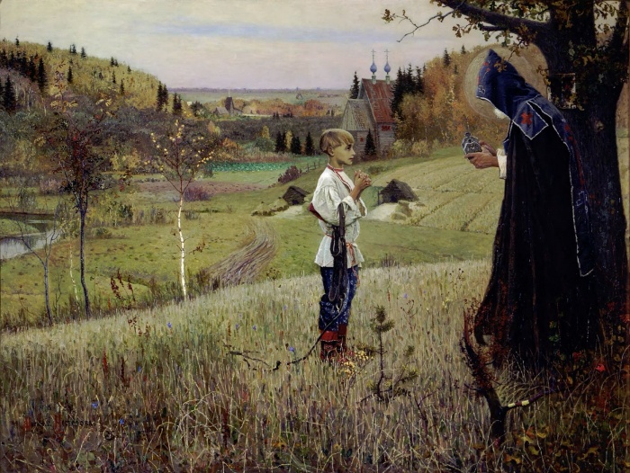 На склоне лет, обозревая пройденный путь, художник писал: "Я избегал изображать так называемые сильные страсти, предпочитая им скромный пейзаж, человека, живущего внутренней духовной жизнью в объятиях нашей матушки-природы". Стремление передавать глубинную суть человека, его живую связь с Богом отразилось в череде полотен М. В. Нестерова из жизни русских святых. К святому преподобному Сергию Радонежскому (до пострижения – Варфоломею) Михаил Васильевич относился так бережно и любовно, как, пожалуй, ни к одному другому русскому святому. Для него Радонежский чудотворец стал живой драгоценностью. Тепло, ею рожденное, следовало бережно извлечь из потаенных недр души и подарить людям. Каковы корни столь пристального интереса художника именно к этому святому? Михаил Васильевич писал в воспоминаниях: образ Сергия Радонежского "...пользовался у нас в семье особой любовью и почитанием". В детские годы этот святой "был нам близок, входил... в обиход нашей духовной жизни". Такое отношение не удивительно — в повседневном существовании купеческой среды, выходцем из которой был Нестеров, вера занимала одно из ключевых мест. Но одной лишь "домашней привычкой", унаследованной от детских и отроческих лет, объяснить особую тягу к Сергию у Нестерова невозможно. Особое значение для художника этот святой обрел намного позже — когда Михаил Васильевич находился в мучительных поисках самобытного творческого пути. Найти этот путь художник сумел, познакомившись с подмосковной усадьбой Абрамцево, с ее постоянными обитателями — и зачарованными абрамцевскими лесами. Сама абрамцевская земля, казалось, помнила Преподобного Сергия. Помнила, как вместе с братом Стефаном ходил он по здешним светлым рощицам, темным чащобам и солнечным полянам в поисках места для будущего монастыря. "Они исходили много лесов и наконец пришли в одно пустынное место в чаще леса, где бил источник воды. Братья обошли то место и полюбили его, ибо Бог направлял их", — так писал в житии святого его младший современник, Епифаний Премудрый. Картина «Видение отроку Варфоломею» написана Нестеровым в 1890 на сюжет, взятый из «Жития преподобного Сергия» авторства Епифания Премудрого. Нестеров избирает эпизод из жизни святого Сергия, когда благочестивому отроку, посланному отцом на поиски пропавшего стада, было видение. Таинственный старец, к которому отрок, тщетно пытавшийся овладеть грамотой, обратился с молитвой, одарил его чудесным даром премудрости и постижения смысла Священного Писания. На фоне лесов и полей на переднем плане картины стоят две фигуры-мальчика и явившегося ему под деревом святого. Душа юного Варфоломея, будущего великого подвижника Сергия Радонежского, трепетно внимает Богу, молитвенная сосредоточенность отрока поражает зрителя. В процессе работы над картиной Нестеровым было сделано множество различных этюдов. На одном из них Варфоломей, например, стоял сначала перед старцем спиной к зрителю. Лица его не было видно, а вся фигура со светловолосой головой и нарядная одежда скорее напоминали образ сказочного пастушка Леля, а не будущего подвижника. В дальнейшем Нестеров переносит главный акцент на фигуру маленького Варфоломея, которая и стала впоследствии, смысловым центром всей картины. В "Видении отроку Варфоломею" удивительно сильно передано умиленное молит