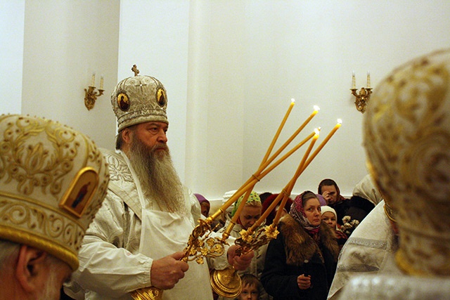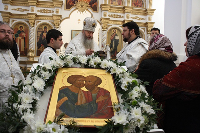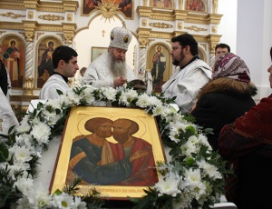 Владыка Тихон освятил в Кудряшах Петропавловский храмВ день празднования зачатия праведной Анною Пресвятой Богородицы Митрополит Новосибирский и Бердский Тихон совершил Великое Освящение новосооруженного храма в честь святых первоверховных апостолов Петра и Павла в поселке Кудряшовский Новосибирской области. Ему сослужили шесть священников: помощник Управляющего Епархией протоиерей Александр Реморов, помощник настоятеля Вознесенского кафедрального собора протоиерей Борис Свинин, секретарь Новосибирской Епархии протоиерей Георгий Патрин, руководитель миссионерского отдела Митрополии, ключарь Александо-Невского собора протоиерей Константин Работа, настоятель храма Всех Святых протоиерей Константин Пантюхов, руководитель паломнического центра Митрополии, настоятель Кудряшовского Петропавловского храма протоиерей Владимир Бобров. В день освящения (обновления) в притворе заполненного прихожанами Петропавловского храма Владыку Тихона приветствовал настоятель прихода протоиерей Владимир Бобров: «Просим, Владыко, освятите сей храм! Ис пола эти, Деспота! (от греческого eis polla ete Despota — многая лета, Владыко)». Сразу после освящения храма начали читать часы, по завершении которых Владыка отслужил праздничную Божественную Литургию. На Литургии также молились создатели, благотворители и украсители «святаго храма сего». Затем Владыка обратился к православным христианам с архипастырским словом, в котором сказал, что освящение Петропавловского храма в этом поселке для Новосибирской области является историческим событием. Он напомнил, что в августе во время визита в Новосибирск Святейшего Патриарха Московского и всея Руси Кирилла в присутствии Его Святейшества Владыка Тихон и губернатор Новосибирской области Василий Юрченко подписали Соглашение о сотрудничестве между Новосибирской Митрополией и Правительством Новосибирской области, которое в частности предполагает реализацию программы строительства в городе и области 120 храмов. "И этот храм — первый, который мы освятили в рамках программы", — отметил Владыка Тихон. Правящий Архиерей рассказал, что до революции в городе и области насчитывалось почти 400 храмов. Но за годы лихолетья все они были уничтожены или перестроены. В городе остался лишь Вознесенский собор, а в области, в селе Новолуговое, — Никольская церковь. И служили в епархии только четыре батюшки, против которых активно боролись 200 тысяч атеистических работников. «Вся мощь советского государства была обрушена на Святую Церковь, но она выжила, потому что Русская Православная Церковь — это не священники, это русский православный народ, а народную Веру не остановить на Руси», — сказал Владыка. В то же время Владыка Тихон выразил глубокое сожаление по поводу поразившей людей бездуховности, являющейся следствием безбожного воспитания: «Спрашиваем ребятишек в школе, есть ли среди них русские, православные? Оказывается, нет. Они называют себя панками, рокерами, эмо, готами, кто помладше — человеком-пауком, терминаторами. Нет ребятишек, которые последовали бы нашим русским богатырям, святым Александру Невскому, Илие Муромцу или нашему прославленному воину новосибирцу Александру Покрышкину. Школьники увлечены западными субкультурами и не знают ни нашей истории, ни нашей литературы, и уж тем более не 