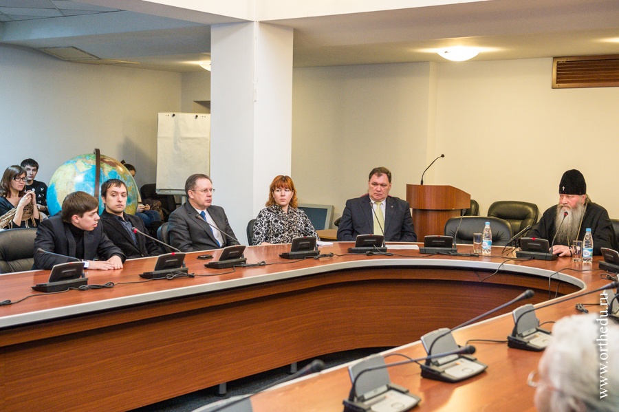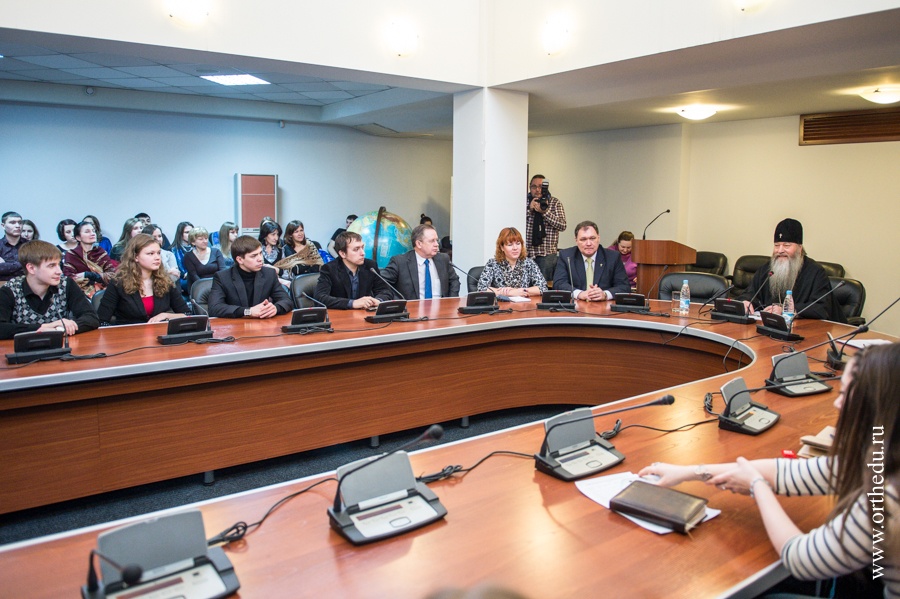 Более часа Владыка отвечал на вопросы преподавателей и студентов. На вопрос преподавателя журналистики о том, кто виноват в безнравственности общества, и почему Церковь не примется за перевоспитание молодежи, Владыка Тихон ответил: "Наше общество идет по пути бездуховности, и обвинить в этом кого-то невозможно. Церковь не является частью государства по формированию духовных ценностей. Церковь готовит граждан для государства Христова. Церковь и государство разделены, и мы можем только расширять или сужать свое влияние на общество. Но если спрашивать, кто виноват? Всегда отвечаю: я виноват, виноват каждый конкретный человек. Что делать? Исправить себя".
