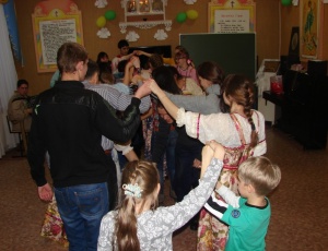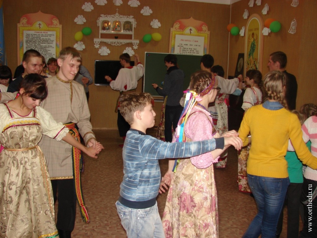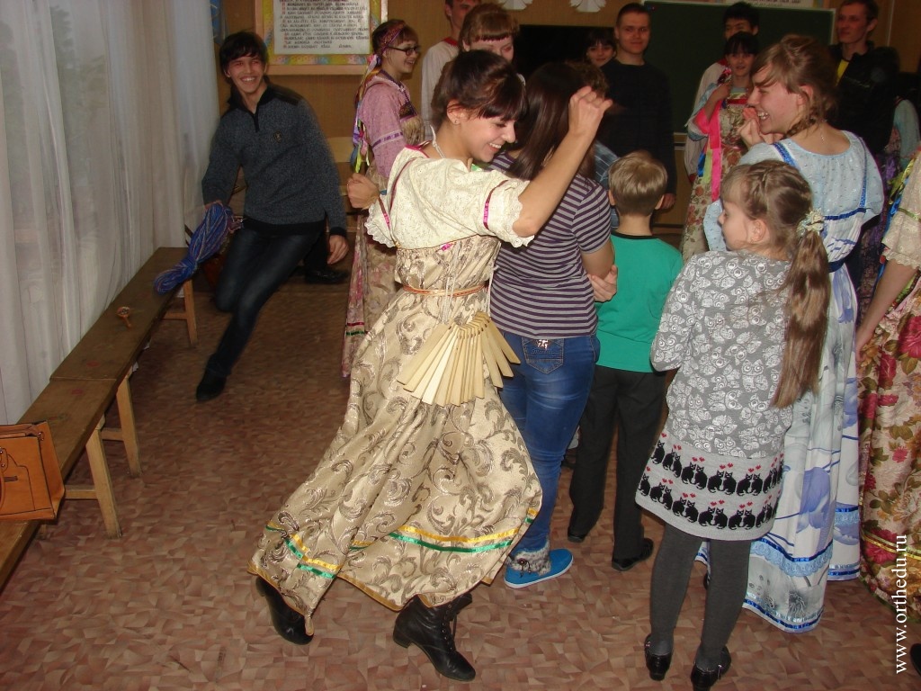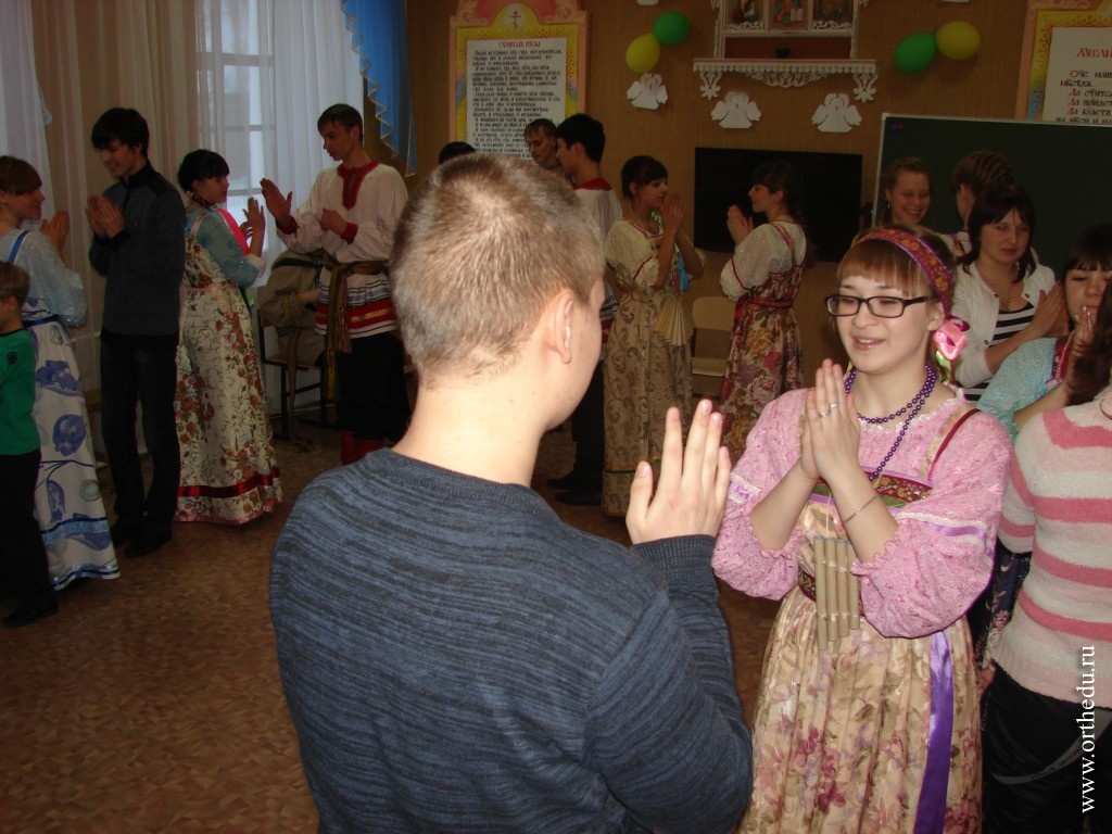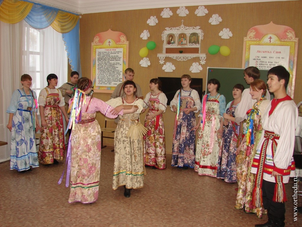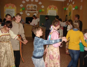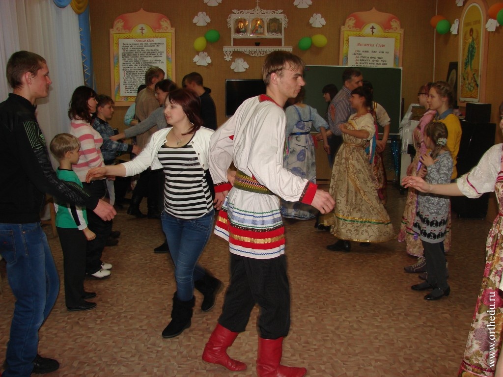 Русская народная вечёрка в Каинске (фоторепортаж)25 февраля в здании Церковно-приходской школы Кафедрального собора г.Куйбышева состоялась русская народная вечёрка. Мероприятие проводилось усилиями студентов Колледжа культуры г.Барабинска. Вечёрка — это в первую очередь праздник. И это когда не тебя веселят, а когда ты сам веселишься. Сейчас уже почти перестали петь вместе, забыли песни. При этом зрителей как таковых нет, все участвуют, все поют, все танцуют, обычно под гармошку, водят хороводы. Не беда, если не знаешь песен и танцев. Самое главное, чтобы кто-нибудь знал, как петь, как танцевать, и мог простым языком объяснить и показать это другим. Ребята из колледжа культуры знали все это на отлично и с удовольствие учили других. Некоторые слова и движения учатся на ходу. Очень часто слова в народной песне повторяются не один раз. В отличие от академического искусства, народные музыкальные формы сами по себе предназначены для включения любого, было бы желание. Вечёрка не первый и не последний раз проводится на приходе.