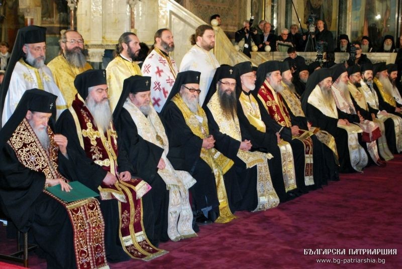 Гости, приехавшие на интронизацию Его Святейшества. Фото: Атанас Димитров - www.bg-patriarshia.bg В Патриарший собор ранее прибыли предстоятели и представители поместных Православных сестринских Церквей: Блаженнейший Хризостом II, архиепископ Новой Юстинианы и всего Кипра вместе с епископом Хитронским Леонтием и диаконом Киприаном Кундурисом - Кипрская архиепископия, а также, Его Блаженство Христофор – архиепископ Праги и Митрополит Чешских и Словацких земель вместе с епископом Ходонинским Иоакимом, священником Николаем Петровым и священникомПламеном Тодоровым. Приехали, и представители других поместных Православных Церквей: митрополит Эдесский Иоиль, митрополит Илиопольский Феодор - Александрийский Патриархат; митрополит Тирский и Сидонский Илия – Антиохийский Патриархат; митрополит Востронский Тимофей – Иерусалимский Патриархат; митрополит Волоколамский Иларион, протоиерейНиколай Балашов и протоиерейИгорь Якимчук – Русская Православная Церковь. Также, митрополит Никозкий и Цхинвальский Исаия и протоиерей Давид Шарешанидзе – Грузинская Православная Церковь; епископ Шумадийский Иоанн – Сербская Православная Церковь; митрополит Тырговишский Нифон – Румынская Православная Церковь; митрополит Драмский Павел и протопресвитер Стефанос Аврадимис – Греческая Архиепископия; архиепископ Белосткский Гданский – Польская митрополия; митрополит Бератский Игнатий – Албанская архиепископия и еще многие священники и миряне в составе церковных делегаций.