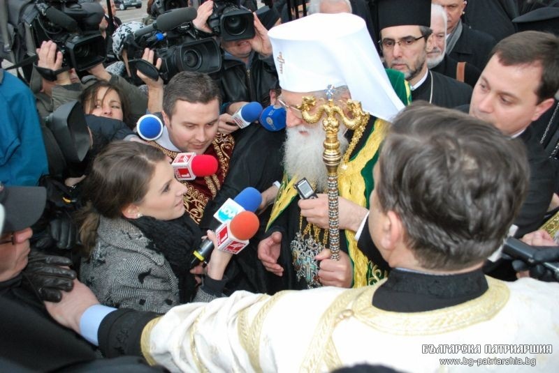 Литийное шествие во главе с Его Святейшеством. Фото: Атанас Димитров - www.bg-patriarshia.bg После пятичасовых патриарших выборов новоизбранный Первопредстоятель, одетый в черную архиерейскую мантию, епитрахиль и омофор, с митрой на голове и крестом для благословения, а также члены и служители Свящ. Синода, епископы БПЦ, делегаты ПИЦС отправились в Патриарший собор Св.Александра Невского[1]. Под непрекращающийся звон церковных колоколов было объявлено,чтоунас (в Болгарии) есть Патриарх. Выбранный согласно каноном и церковному уставу наш Первоиерарх, сопровождаемый участниками литийного шествия, вошел в Патриарший собор Св.Александра Невского, где его уже ждали представители болгарской государственности – президент Росен Плевнелиев, председатель 41-го Народного собрания[2] Цецка Цачева[3], болгарское правительство, экс-премьер-министр Симеон Сакскобургготский, дипломаты, депутаты, представители болгарской армии, официальные гости, тысячи верующих и сотни журналистов.