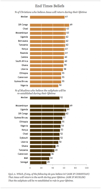 Другим показателем, отражающим важность религии в жизни африканцев, согласно исследованию, стала поддержка участниками опроса Священного Писания в качестве правовой основы жизни в стране. В среднем 60% опрошенных христиан назвали Библию источником права в стране. В Замбии, Нигерии и Гане таковых оказалось более 70%. Среди мусульман результаты опроса оказались такими же – 63% опрошенных называют шариат, основанный на Коране, Сунне и местных исламских правовых традициях, в качестве основного закона. В Джибути этот показатель достиг 82% — в этой стране по данным Pew Forum 97% населения — мусульмане. В семи странах больше трети населения поддерживают смертную казнь за выход из ислама.