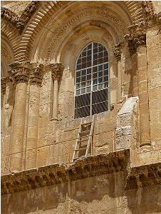И никто её не может убрать. Дело в том, что деревянная лестница, приставленная к правому окну фасада Храма Гроба Господня опирается на карниз, принадлежащий Греческой православной церкви, и приставлена к окну, находящемуся во владении Армянской апостольской церкви. Нахождение лестницы на своём месте означает соблюдение соглашения между шестью христианскими конфессиями, владеющими храмом, — не двигать, не ремонтировать и не изменять ничего в храме без согласия всех шести конфессий. Лестница является одним из символов разногласий в христианстве. Дожди в этой климатической зоне редки, климат сухой и жаркий, поэтому дерево сохраняется очень хорошо.