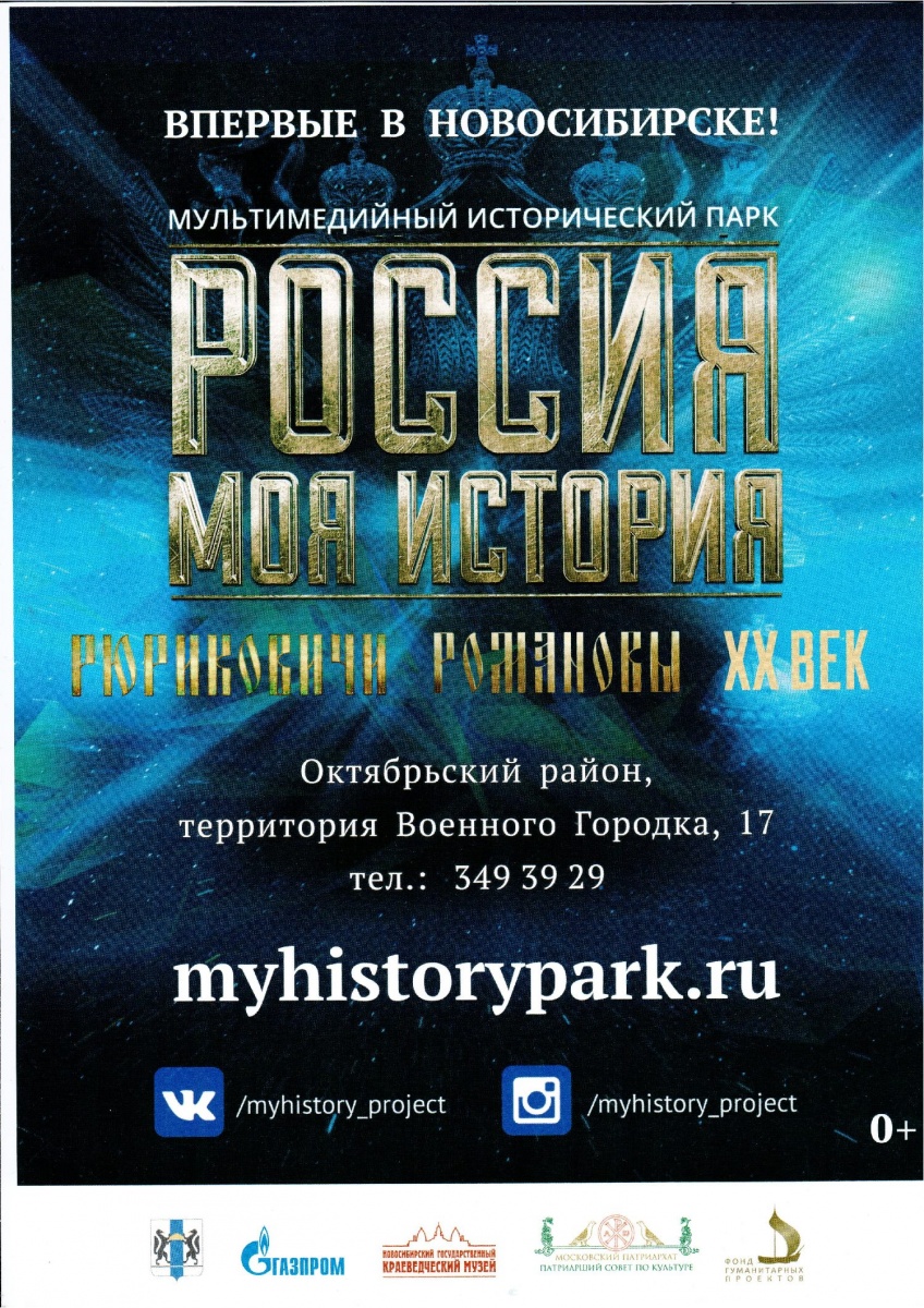 «Россия – Моя история» – это мультимедийный исторический парк, посвящённый истории России с древнейших времён до наших дней. Идея создания принадлежит ответственному секретарю Патриаршего совета по культуре епископу Егорьевскому Тихону (Шевкунову), который возглавляет экспертный совет Фонда Гуманитарных Проектов. Проект «Россия – Моя история» получил начало в 2013 году вместе с открытием первой выставки цикла мультимедийных экспозиций, посвящённых истории Отечества. За период с 2013 года по сегодняшний день создано 4 типовых экспозиции («Романовы», «Рюриковичи», «От великих потрясений к Великой Победе», «Россия — Моя история. 1945-2016»). Создатели парка – историки, художники, кинематографисты, дизайнеры, специалисты по компьютерной графике – сделали всё, чтобы российская история перешла из категории чёрно-белого учебника в яркое, увлекательное и вместе с тем объективное повествование, чтобы каждый посетитель почувствовал сопричастность к событиям более чем тысячелетней истории своего Отечества. В историческом парке представлены все формы информационных носителей: сенсорные столы и экраны, вместительные кинотеатры, лайтбоксы, коллажи, проекторы, планшетные компьютеры и многое другое. В подготовке экспозиции использованы приёмы видеоинфографики, анимации, трёхмерного моделирования и цифровых реконструкций. Новосибирская область вошла в число 19 пилотных регионов России, где реализуется проект мультимедийного исторического парка «Россия – Моя история». Новосибирское представительство проекта содержит, в том числе, исторические материалы по важнейшим событиям истории и развития региона.