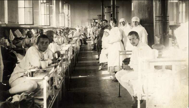 Плакат 1-й мировой войны, 1915 (lomasm.ru) Многие именитые горожане жертвовали на обустройство раненых, детей погибших и потерявших трудоспособность на войне. В сибирских городах создаются отделения Петроградского общества вспомоществования «бедным семействам поляков и бедствующему польскому населению» [5]. Ново-Николаевск размещает у себя около 3 500 семей беженцев оказывая им как финансовую, так и продовольственную помощь, предоставляя льготы на обучение детям Георгиевских кавалеров. Жители собирают бельё и теплую одежду. Беседин Алексей Григорьевич, городской голова (20.12.1914):«Граждане, жертвуйте на помощь раненым воинам русской армии. Каждая лишняя ваша посылка в сегодняшний день, каждый лишний рубль, каждый двугривенный, опущенный в кружку, которыми будут снабжены извозчики, даст возможность приобрести для воинов лишнюю смену белья. Помните, что только дружная поддержка всей страны поможет выйти с честью из ниспосланного родине испытания» [6]. Не забывает город и сражающихся на фронтах. Ещё осенью 1914-го в Петрограде создано Сибирское общество подачи помощи больным и раненым воинам. Им создаются полевые и этапные лазареты и шесть врачебно-питательных отрядов. Для попечения раненых воинов-сибиряков 8 марта 1915 года отделом Сибирского общества под председательством Н.А. Туркина был создан «санитарный отряд имени Ново-Николаевского отдела». С патронажем члена Государственной думы IV созыва В. Н. Пепеляева. Свою деятельность 3-й Сибирский Ново-Николаевский врачебно-питательный отряд развернул в Польше, где сражалось много сибирских полков. Военный лазарет 4-го Сибирского стрелкового корпуса (Новосибирский краеведческий музей) В разные годы Гражданской войны в городе находилось 12 госпиталей и лазаретов. Под них были заняты поезда, санитарные летучки. В войсках работали перевязочные, эпидемические отряды. Не хватало врачей, лекарств и материалов. Копылов Г. доктор: «С востока привозили и привозят хоть и контрабандой много необходимых для больного населения вещей. Марлю, например, можно купить в городе в довольно большом количестве, но разумеется, по дорогой цене. Но эта марля вряд ли попадёт в наши госпитали. Наших героев будут перевязывать корпией, как 50 лет тому назад, а марля пойдёт на цели, ничего общего с медициной не имеющие» [7]. Вдобавок к войне, антисанитарии, десяткам тысяч беженцев в город пришли эпидемии холеры и тифа. Среди зараженных и больных было не только гражданское население, но и много военных. По госпиталям и баракам в городе насчитывалось до 70 000 больных тифом и туберкулёзом. Записка военных врачей сотрудникам Чекатифа от 13 января 1920:«Военный городок – это зараженный, вымирающий пункт <…> Приходится опасаться за то, чтобы он не превратился в сплошное кладбище» [8]. Здесь, том числе в военном госпитале, находилось до 20 000 больных пленных белогвардейцев, не считая тысяч уже умерших. После взятия Ново-Николаевска красной армией, новая власть стала решительно бороться с эпидемией. Госпитали и лазареты оборудовались в самых разных учреждениях: в кинотеатрах, гимназиях, в ресторане «Универсаль», в здании спиртового завода Злоказова, в доме окружного суда, в еврейском училище. Вопреки требованиям, для больных устраивались двойные нары, но их всё равно не хватало. Так, в Восьмом Ново-Николаевском госпитале больные лежали 
