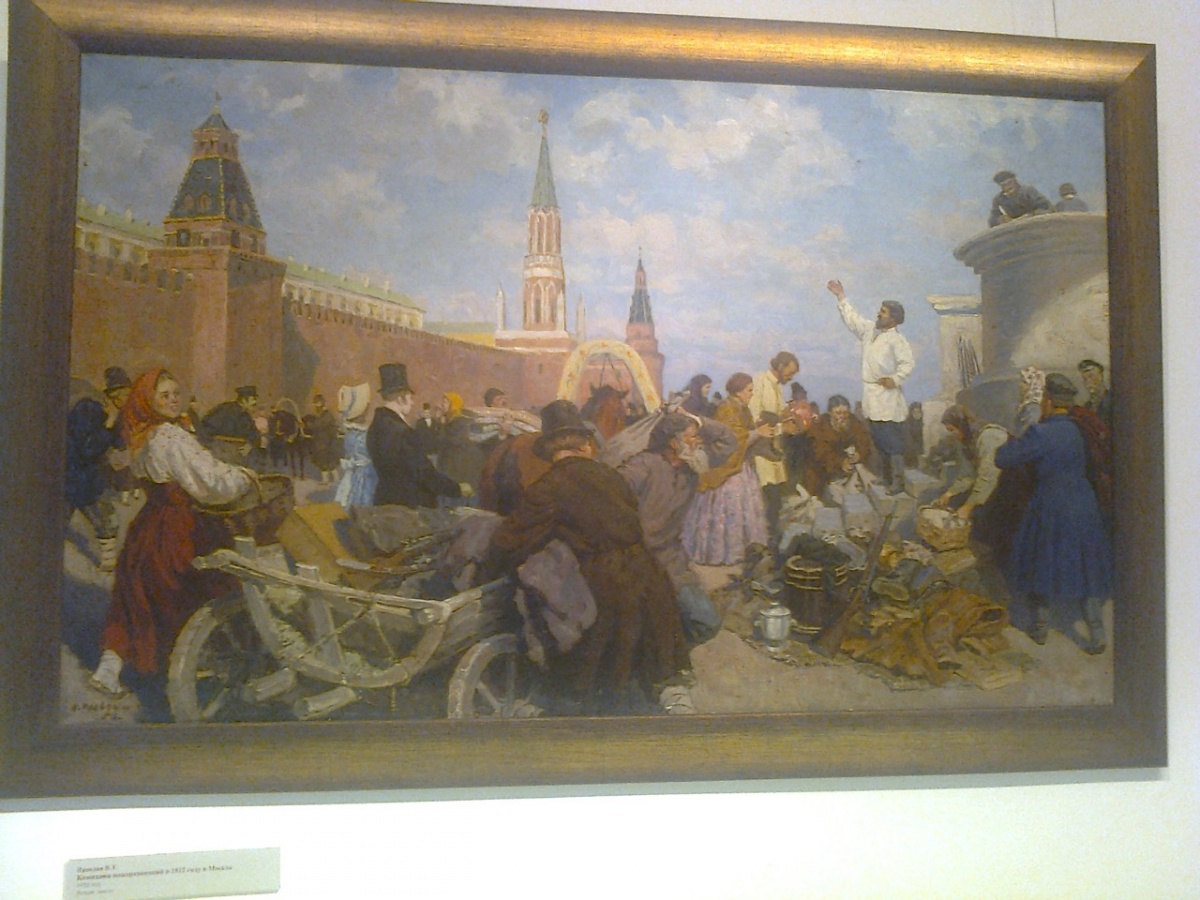 Картина Правдина В. «Кампания пожертвований в 1812 году в Москве». Москва, Красная площадь, возле памятника Минину и Пожарскому стоит телега, проходит сбор пожертвований: вещи, продукты, драгоценности. Р. М. Зотов в своем романе «Два брата или Москва в 1812 году» так описывает эту кампанию: «Много эпох славы имела Москва в продолжение своего существования, но славнее, величественнее эпохи 1812 года не имел ни один город в мире. И я говорю это не о пожаре: это бедствие и эта слава были еще впереди, но я разумею эпоху приезда Александра I в Москву. Царь обширнейшей монархии в свете приходит беседовать с своим народом, рассказывает ему, что силы врагов несметны, что нужны меры необычайные, силы великие, пожертвования, достойные имени русского, - и высокие слова государя нашли достойный ответ в сердцах подданных. Поступки, слова, дела, пожертвования москвичей в эту эпоху выше всего! Слава первого народного порыва принадлежит Москве, и потомство должно воздвигнуть памятник древней русской столице за высокие ее подвиги в 1812 году. И при всем том никто еще не воображал, что это только начало геройства и пожертвований Москвы».
