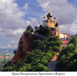 Форосская церковь стоит над побережьем на почти полукилометровой скале. А к северу вздымаются крутые кудрявые холмы, куда сворачивает по крутизне шоссе, и где наверху располагается знаменитый перевал Байдарские ворота. С трудом можно вообразить себе, что дорогу здесь в короткое время соорудили в середине позапрошлого века солдаты русской армии, естественно, с самыми примитивными орудиями труда. Девятикупольный храм в русском стиле возведен по проекту (1888 г.) академика Н.М. Чагина на средства купца А.Г. Кузнецова в память спасения царской семьи в железнодорожной катастрофе и посвящен в 1892 году Воскресению Христову. В следующем веке храм был неоднократно разрушен и стоял в запустении до конца века, но был восстановлен, и теперь это чудо православной архитектуры возвращено народу.