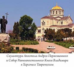 Престол в приделе апостола Андрея Первозванного находится в пещере, царские врата сделаны в сплошной скальной алтарной перегородке. Высеченные в горе помещения, конечно, тесны, но украшены русскими иконами, некоторые из них достаточно древнего письма. Таинственный полумрак иногда просветляется лучом внешнего света. Византийский стиль храма Пантелеимона вовсе не придает ему тяжеловесности, главные нефы и притворы расположены уже в примыкающих к скалам частях здания. Здесь же хранятся частицы святых мощей юного великомученика и целителя. Церковь Николая Мирликийского была сооружена на Каламит- ском плато в форме крестообразного здания. Здесь останавливалась Екатерина II во время своего путешествия по Новороссии и Крыму в 1787 году, и после этого царственная семья всегда уделяла древнему монастырю свое внимание. Храмы монастыря были самым позорным образом разграблены французами и англичанами, восстановлением древних храмов после Крымской войны занимался археолог и художник Д. М. Струков. А в наше время восстановлением многих церквей занимался архимандрит Августин, он сам расписал иконостас Свято-Троицкой церкви. К несчастью, священник погиб в автомобильной катастрофе. Он похоронен в монастыре. После Инкермана поворачиваем к северу в сторону Бахчисарая, а слева за холмами остается Севастополь с его храмами, многие из которых сооружены в память русских флотоводцев и воинов, павших в двух войнах. Здесь похоронены адмиралы Корнилов, Нахимов и Истомин, лейтенант Шмидт, а часовни стоят над захоронениями простых, зачастую безымянных русских солдат и матросов, которые в конце концов так и не отдали город русской славы Севастополь врагам из «просвещенной» Европы. Но в первую очередь вспомним Херсонес Таврический, где крестился равноапостольный князь Владимир, здесь же в память посещения Крыма Андреем Первозванным стоит скульптурное изображение апостола, а рядом возвышается величественный собор, освященный во имя князя Владимира. Пятнадцать лет тому назад, во время одного из наших посещений Крыма собор еще находился в лесах восстановления после всех разрушений.