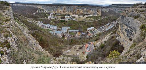 Главная православная святыня Бахчисарая - Свято-Успенский монастырь. Он расположен в каньоне Мариам-Дере, на дне и склонах этой живописной долины, а также в отвесных скалах крымской яйлы. К монастырю пришлось метров 300 подниматься пешком по довольно крутой дороге, так как автомобильное движение здесь, на территории монастыря, в этой экологически весьма хрупкой природной обстановке, нежелательно. Монастырь укрыт в обрывах куэсты, к часовне у входа возвышается монументальная лестница. Часть помещений монастыря расположена в отвесных стенах куэсты.