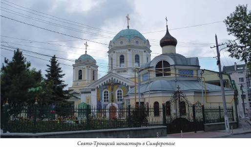 Живописная дорога вливается в город - столицу Крыма - Симферополь. По количеству православных ценностей город, конечно, заслуживает самостоятельной экскурсии, но у нас время ограничено, поэтому мы сразу высаживаемся в центре и идем в Петропавловский кафедральный собор. Одноименная деревянная церковь была построена и освящена здесь в начале XIX века, в конце века по проекту архитектора К. Лазарева на средства, пожертвованные и собранные купцом Афанасием Тисовым, был возведен каменный храм. В прошлом веке он претерпел массу трудностей и разрушений и только в нашем веке полностью восстановлен в статусе кафедрального собора. Храм соединяет признаки русской древности и классицизма. Соборный неф находится под световым барабаном с куполом. Правда, со стороны главного входа он загорожен замечательной колокольней, зато стены над папертью украшены мозаичными изображениями, напоминающими витающий над Крымом византийский дух. Внутреннее убранство собора, конечно, замечательное, но, к сожалению, утрачены некоторые старинные иконы византийского типа (среди них знаменитая Свято-Троицкая) и другие священные древности. Неф заполнен народом, здесь еще сохранилось и временное рождественское убранство.