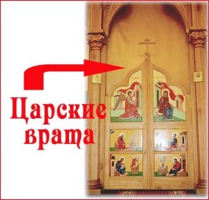 Царские врата. Фото: www.nesterov-cerkov.ru С космологической точкой зрения иконостас отделяет небо и землю, так как храм символизирует мир. В этом смысле иконостас представляет собой перегородкой между видимым и невидимым миром, а святые на нем являются посредниками к невидимому миру, так как они являются связующим звеном между двумя мирами”. Иконостас имеет три входа с дверьми. Через два не больших входа заходят и выходят священнослужители и их помощники во время некоторых моментах Литургии, например, во время совершении Малого и Великого входа. А центральный более большой вход, между алтарем и средней части церкви называется Царскими вратами. Кроме Царских врат средний вход на иконостасе есть и завеса из ткани. Обычно она красная. Иконы иконостаса идентичны во всех православных храмах. На Царских вратах всегда находится икона с изображением сцена, повествующая как Ангел сообщает Деве Марии, что Она избрана Богом и что зачнет от Св. Духа ребенка, который станет Спасителем мира. На правой стороне иконостаса расположены иконы Сына Божия и Святого Иоанна Крестителя, на другой стороне помещены икона Девы Марии с младенцем и образ того, чьем именем названа церковь. Для остальных икон нет точного определения того, какие образа будут там находиться и какое расположение они займут на иконостасе.