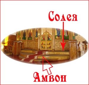 Солея и амвон. Поднятое одной или несколькими ступеньками пространство между цевницами и алтарем называется солеей, а его центральная часть в центре перед алтарем называется амвоном. Здесь священники возносят молитвенные возгласы, произносят проповеди и т. д.