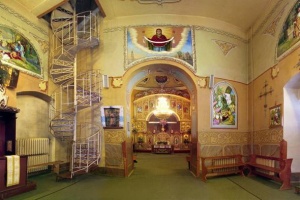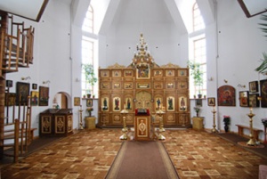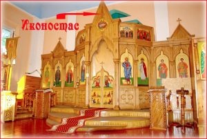 Иконостас.Алтарь и среднюю часть церкви отделяет иконостас. Слово „иконостас” происходит от греческого языка и переводится как „подставка для изображения”, который обычно представляет собой деревянную перегородку с иконками, красивыми резными орнаментами, а сверху, в центре иконостаса находится крест с человеческим черепом. Крест на иконостасе имеет двойной смысл. Он реально представляет собой место смерти Спасителя и символизирует небо.