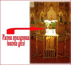 Престольная и праздничная иконы в церкви. Фото: www.nesterov-cerkov.ru В наосе есть аналои (подставки для икон) с иконами Сына Божия, Девы Марии, Св. Троицы, святых и др. Также, в средней части храма есть два аналоя с престольной иконой и праздничной иконой или так называемой иконой дня. Престольная икона - это икона, на которой написан образ святого и событие праздника, чье имя носит данный православный Божий дом. Икона дня – это икона, изображающая праздник или того, чья память отмечается в этот день. Обычно, аналой с этим образом находится в середине наоса.