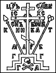 С XI века под нижней косой перекладиной восьмиконечного креста появляется символическое изображение головы Адама, погребенного по преданию на Голгофе (по-евр. - "лобное место"), где и был распят Христос. Эти его слова проясняют сложившуюся на Руси к XVI веку традицию производить около изображения "Голгофы" следующие обозначения: "М.Л.Р.Б." - место лобное распят бысть, "Г.Г." - гора Голгофа, "Г.А." - глава Адамова; причем кости рук, лежащие перед головой, изображаются: правая на левой, как при погребении или причащении.