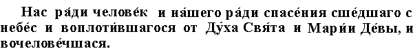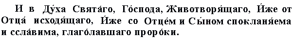 | Верую в единого Бога Отца Вседержителя, Творца неба и земли, и всего видимого и невидимого. (Верую) и в единого Господа Иисуса Христа, Сына Божия, Единородного, Который прежде всех веков родился от Отца, (как) Свет от Света, истинный Бог от истинного Бога, родился, а не сотворен, и имеет одно существо с Отцом, и Которым все сотворено. (Верую в Господа Иисуса Христа) для нас людей и для нашего спасения сшедшего с небес, принявшего тело от Марии Девы через наитие на Нее Духа Святого и сделавшегося человеком. (Верую в Господа Иисуса Христа) распятого за нас при Понтии Пилате, и страдавшего, и погребенного. (Верую в Господа Иисуса Христа) и воскресшего в третий день согласно с писаниями (пророков). (Верую в Господа Иисуса Христа) и восшедшего на небеса и сидящего по правую сторону Отца. (Верую в Господа Иисуса Христа) и Который опять придет со славою, (чтобы) судить живых и мертвых, Которого Царству не будет конца. (Верую) и в Духа Святого, Господа, дарующего всему жизнь, от Отца исходящего, чтимого и славимого наравне с Отцом и Сыном, говорившего через пророков. (Верую) во единую (одну) Святую, Вселенскую и Апостольскую Церковь. Признаю одно крещение для оставления грехов. Ожидаю воскресения мертвых И жизни будущего века. Аминь. |