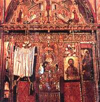 Святыня обители – икона Богоматери, по преданию, написанная евангелистом Лукой с самой Девы Марии. Икона завешена покровом, который снимается лишь при наступлении летней засухи, когда святыню переносят на другую вершину, в более прохладное место. Однако и во время молебна монахи не смотрят на лик. |