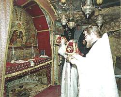 Византийская императрица Елена, воздвигая храм над «вертепом» (пещерой), в котором родился Христос, руководствовалась точными указаниями местонахождения святой пещеры. Местом рождения Христа считается ниша в стене, освещаемая 15 лампадами. |