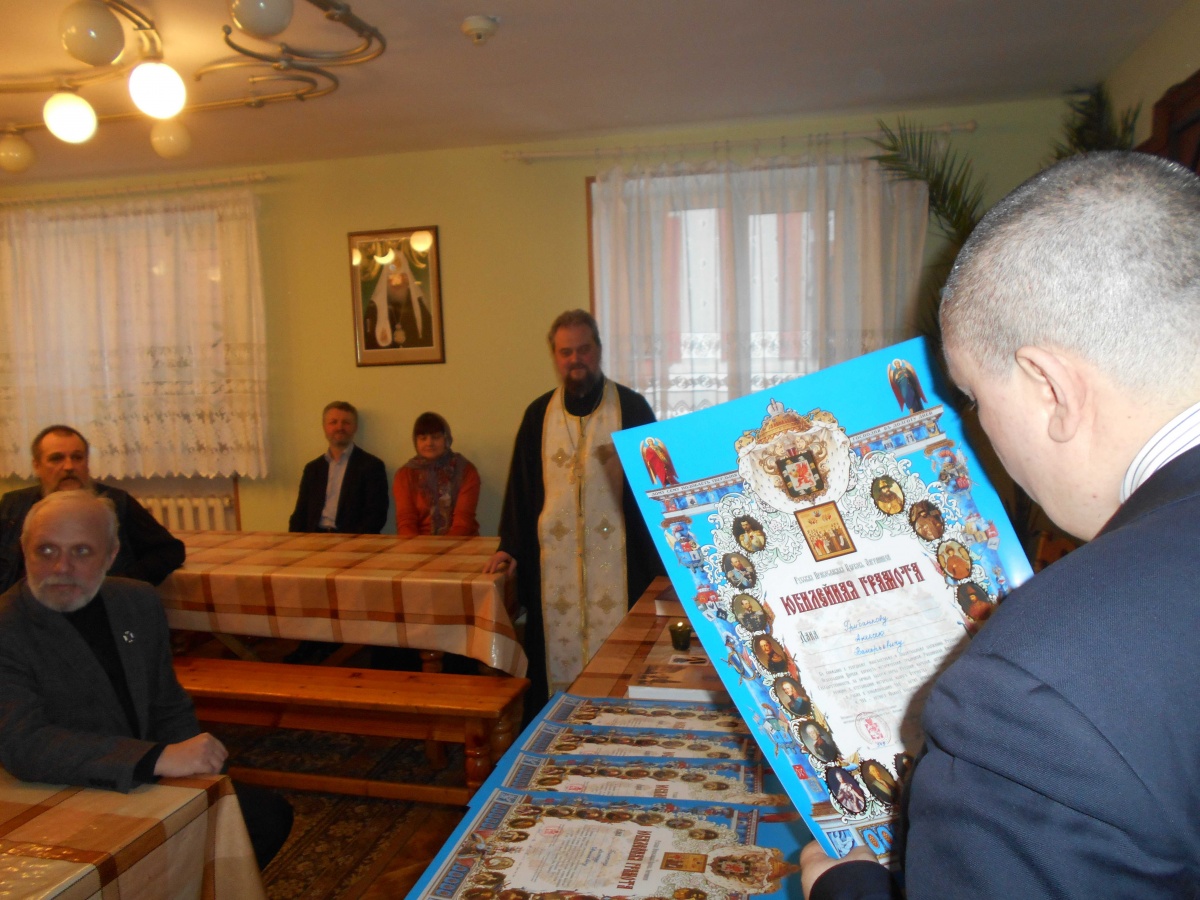«Царская школа» - книга о системе начального, среднего и высшего образования в Российской Империи22 февраля 2016 г. в Синодальном отделе Русской Православной Церкви по связям с Вооруженными силами и правоохранительными учреждениями состоялась презентация книги «Царская школа» известного писателя – историка Бориса Глебовича Галенина, начальника Штаба Войсковой Православной Миссии. Издание допущено к распространению Издательским советом Русской Православной Церкви № ИС-14-401-0006. Заведующий информационно–аналитическим сектором Отдела иерей Андрей Дьяченко отслужил молебен перед Чудотворной мироточивой иконой Царя Николая, привезенной Игорем Смыковым и Борисом Галениным. После окончания молебна начальник Войсковой Православной Миссии Игорь Евгеньевич Смыков вручил награды деятелям православной общественности. Медаль «В память Великой войны», учрежденная Войсковой Православной Миссией, «за многолетние миссионерские и просветительские труды, любовь к Богу, верность Царю и Отечеству» была врученаНикитину Виктору Андреевичу и Ачкасову Виктору Ивановичу. Юбилейная грамота, украшенная портретами Царей и Императоров Дома Романовых была вручена «Во внимание к усердному, многолетнему и спасительному служению Русской Православной Церкви, верность историческим традициям Российской Имперской Государственности, за личные заслуги перед Русским народом, активную жизненную позицию в отстаивании интересов нашего Отечества – Царской России, а также в ознаменование 400 – летия преодоления смуты и 400 – летнего Юбилея воцарения Дома Романовых» Азарову Владимиру Алексеевичу, Сальникову Геннадию Павловичу,Болотину Леониду Евгеньевичу, Грибанкову Алексею Валерьевичу. Такая же грамота будет вручена писателю Виктору Николаеву и иеромонаху Вениамину (Ковтуну). Благодарность Комитета ветеранов Федеральной службы безопасности и локальных войн «За активное участие в реализации социальной Программы поддержки ветеранов органов госбезопасности и членов их семей, укрепление традиционных духовно – нравственных ценностей, личный вклад в дело подготовки молодого поколения к защите нашего Отечества» была вручена иерею Андрею Дьяченко, известному церковному деятелю Саулкину Виктору Александровичу, члену Общества изучения истории отечественных спецслужб Галенину Борису Глебовичу, Макарчуку Анатолию Борисовичу, Пурину Игорю Александровичу, Яковлеву–Козыреву Алексею Алексеевичу.