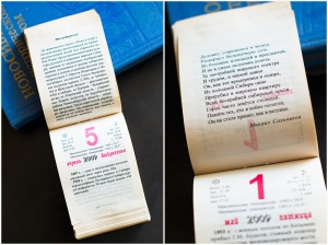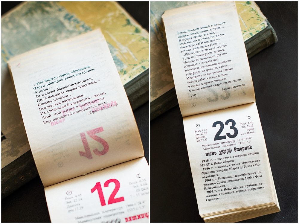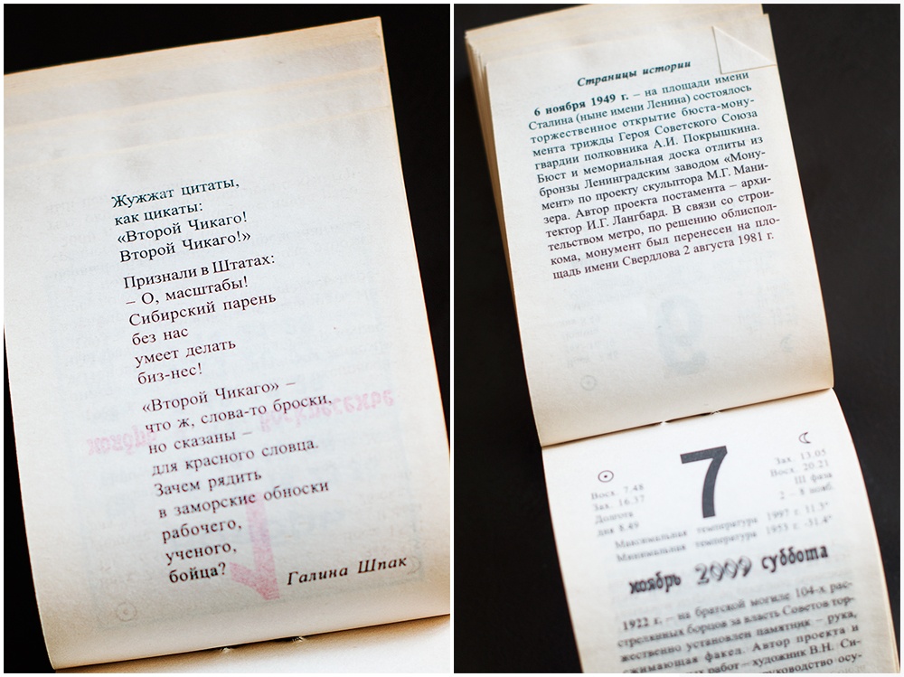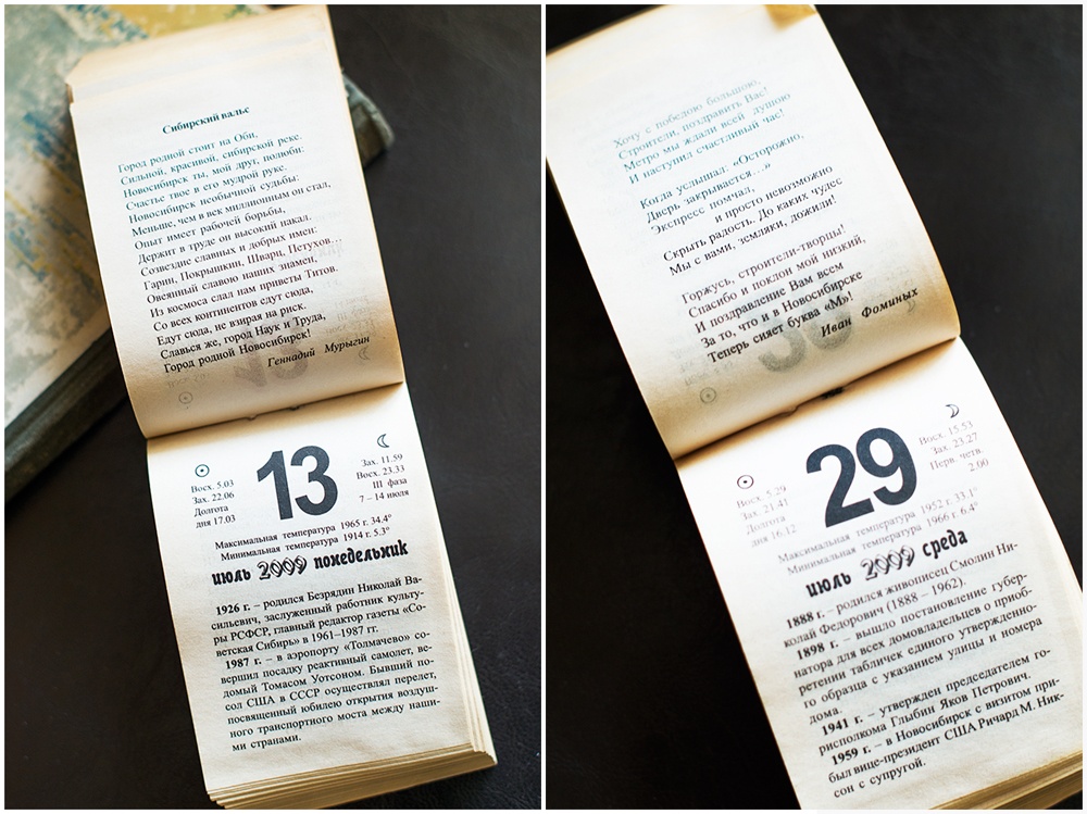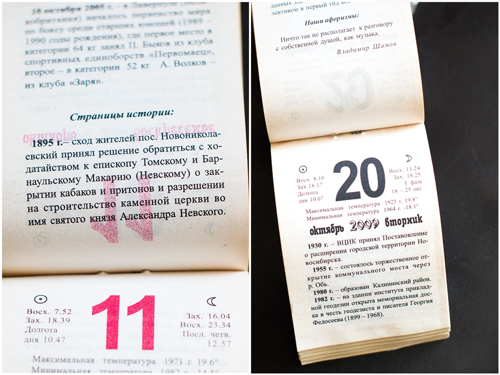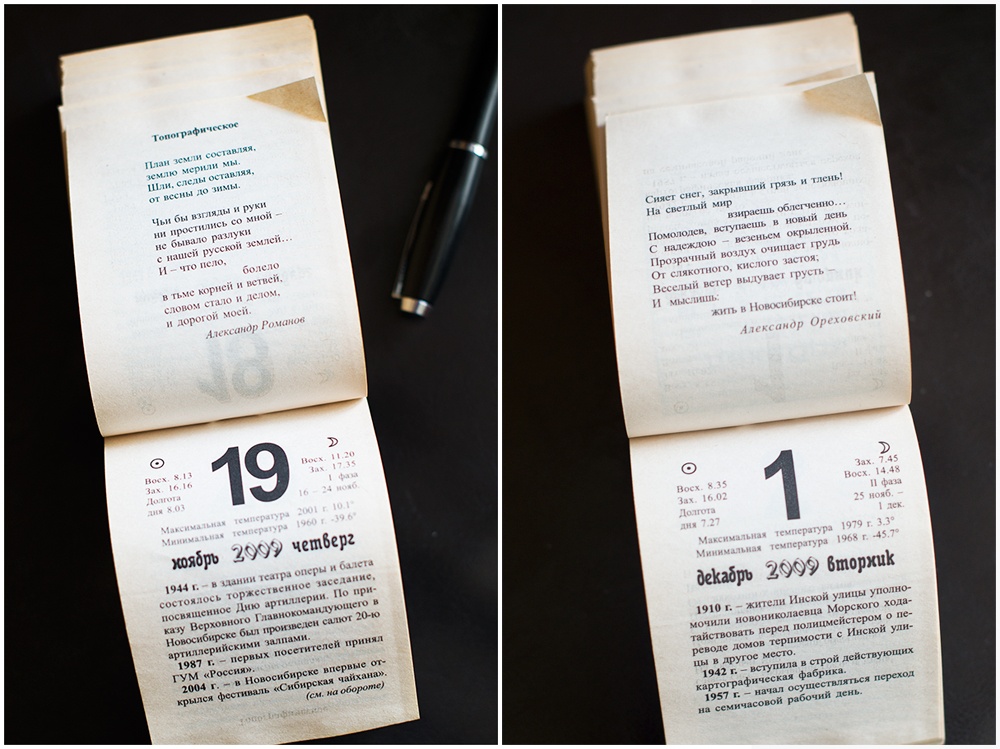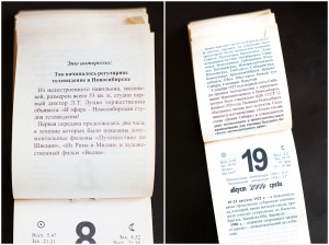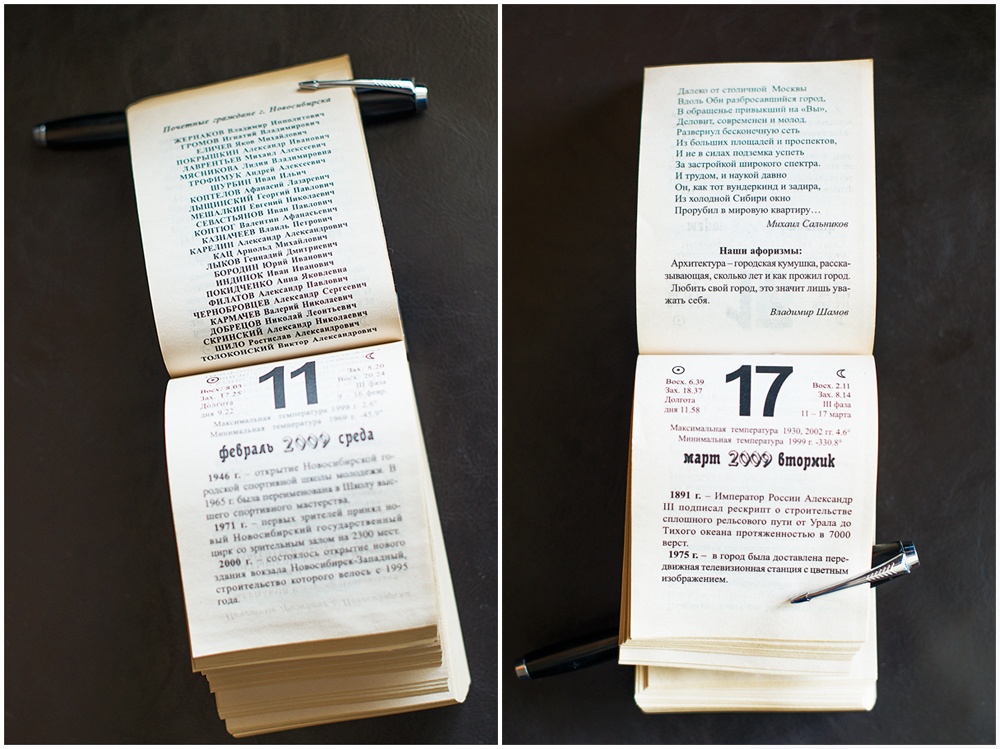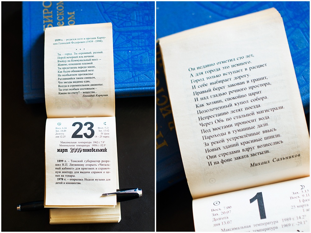 Листая календарь, узнаю много интересной и познавательной информации. По количеству радона Новосибирск почти как Белокуриха. А первый эфир телевидения был какой-то не патриотичный. Зато вот стихи патриотичные, хотя и видно, что писали их "к случаю". Есть в численнике и список почётных жителей города, жаль, что без дат.