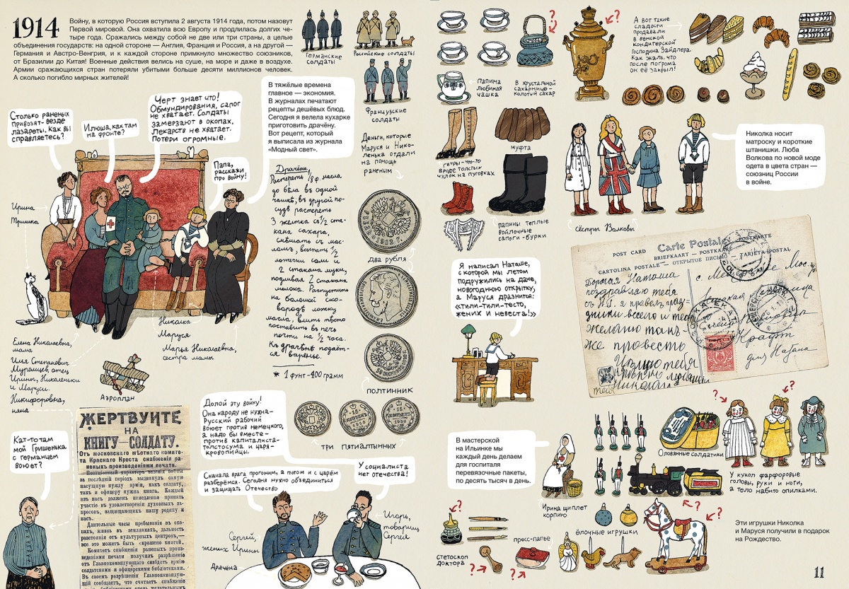 Александра Литвина: Мы долго искали формат, в том числе визуальный. На каждый год приходится одна большая картинка, а другой разворот идет с мелкими предметами и сценками. Это не сразу получилось, мы искали, советовались. Первоначальный макет был совсем другой. Мы даже не предполагали поначалу, что там будет художественная часть и рассказы от лица детей. Думали, что будет отстраненный рассказчик. Но вот, в итоге, пришли к этому.