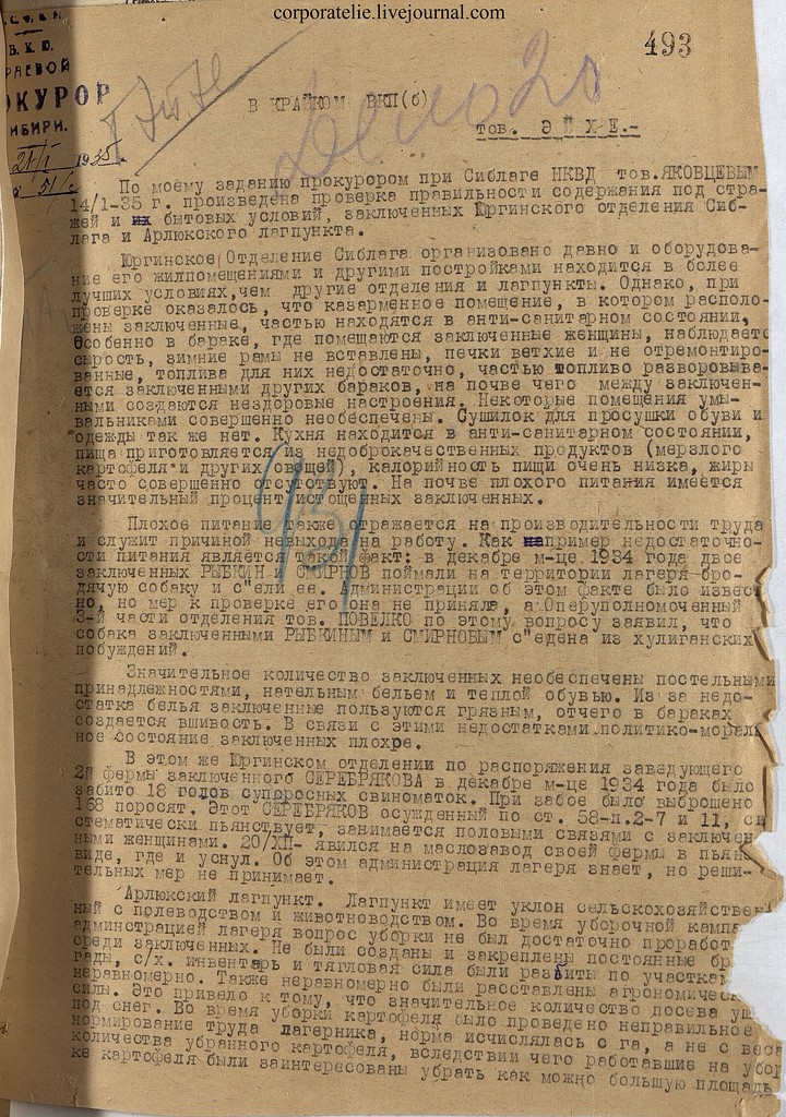 По моему заданию прокурором при Сиблаге НКВД тов. ЯКОВЦЕВЫМ 14/1-35 г. произведена проверка правильности содержания под стражей и бытовых условий, заключенных' Юргинского отделения Сиблага и Арлюкского лагпункта.