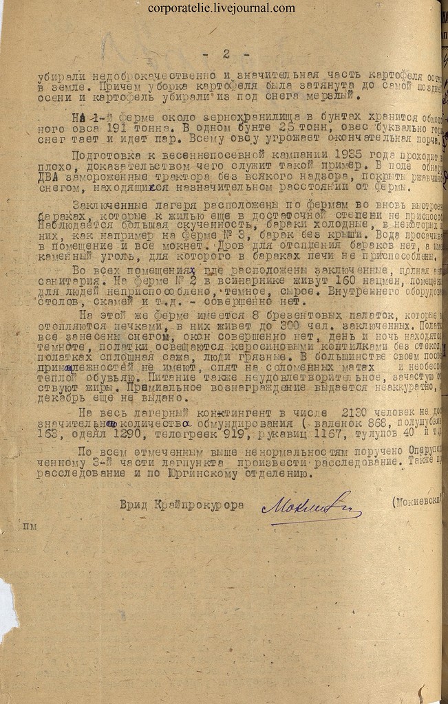 Материал позволяет более пристально взглянуть на бытовые условия, в которых жили в этот относительно "спокойный" для уголовно-исполнительной системы период советские заключенные Юргинского отделения и Арлюкского лагпункта Сибирского исправительно-трудового лагеря. Как можно заметить, особенно безобразной была ситуация со снабжением одеждой и продовольствием. Документ также довольно ярко иллюстрирует ситуацию с пенитенциарным сельским хозяйством и специфичными для советского лагерного сектора методами его ведения в указанный период. Письмо публиковалось на "бумаге" в извлечениях, однако полный текст и сканы публикуются в сети впервые.